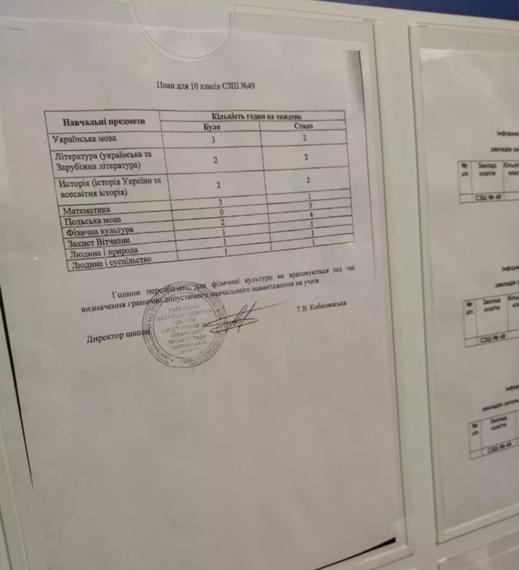 Фотография представляет собой грубый фейк. Вместо украинского слова «iсторiя» написано «исторiя» (очевидно, на смеси русского и украинского). На печати, которой скреплен «документ», можно разглядеть слова «Лубенська загальноосвітня школа», в заголовке упоминается школа № 49, но школы с таким номером в городе Лубны Полтавской области нет, а директор Тамара Кобылянская, этот учебный план якобы подписавшая, работает в школе № 3.