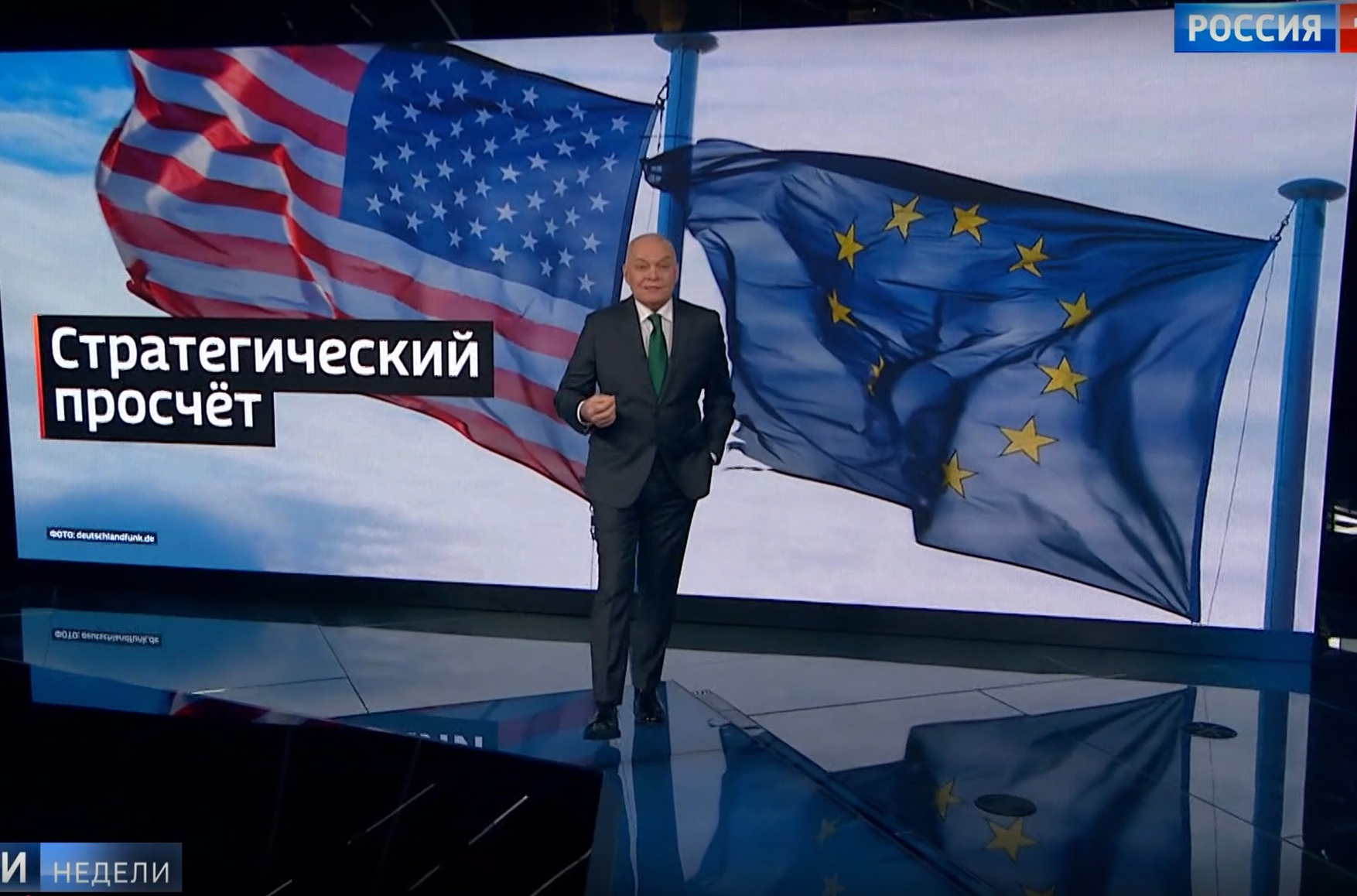Одна из излюбленных тем кремлевской пропаганды — влияние санкций на экономику России и стран Запада. Основной тезис заключается в том, что российской экономике санкции практически не повредили, а вот Запад от них страдает. Говорил об этом и Владимир Путин в послании Федеральному собранию, и Дмитрий Киселев в «Вестях недели», а на этот раз Киселев нашел новое обоснование: