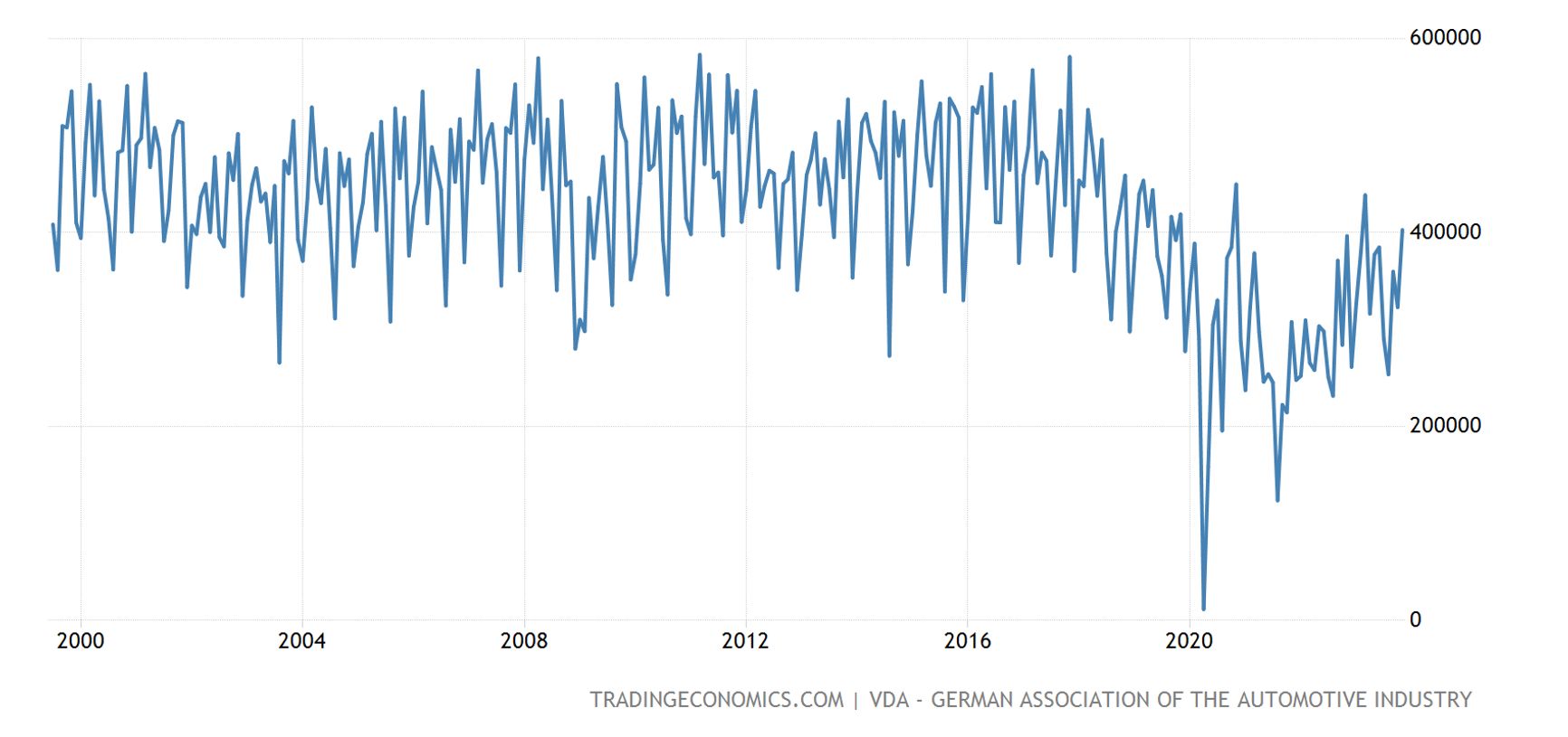 Как видим, производство легковых автомобилей в стране действительно уменьшается по сравнению с пиковым уровнем 2010-х годов. Вот только снижение началось задолго до отказа от российского газа и ухода немецких автопроизводителей с российского рынка. В 2022–2023 годах производство только восстанавливалось после спада конца 2021 года. Влияние санкций никак не прослеживается.