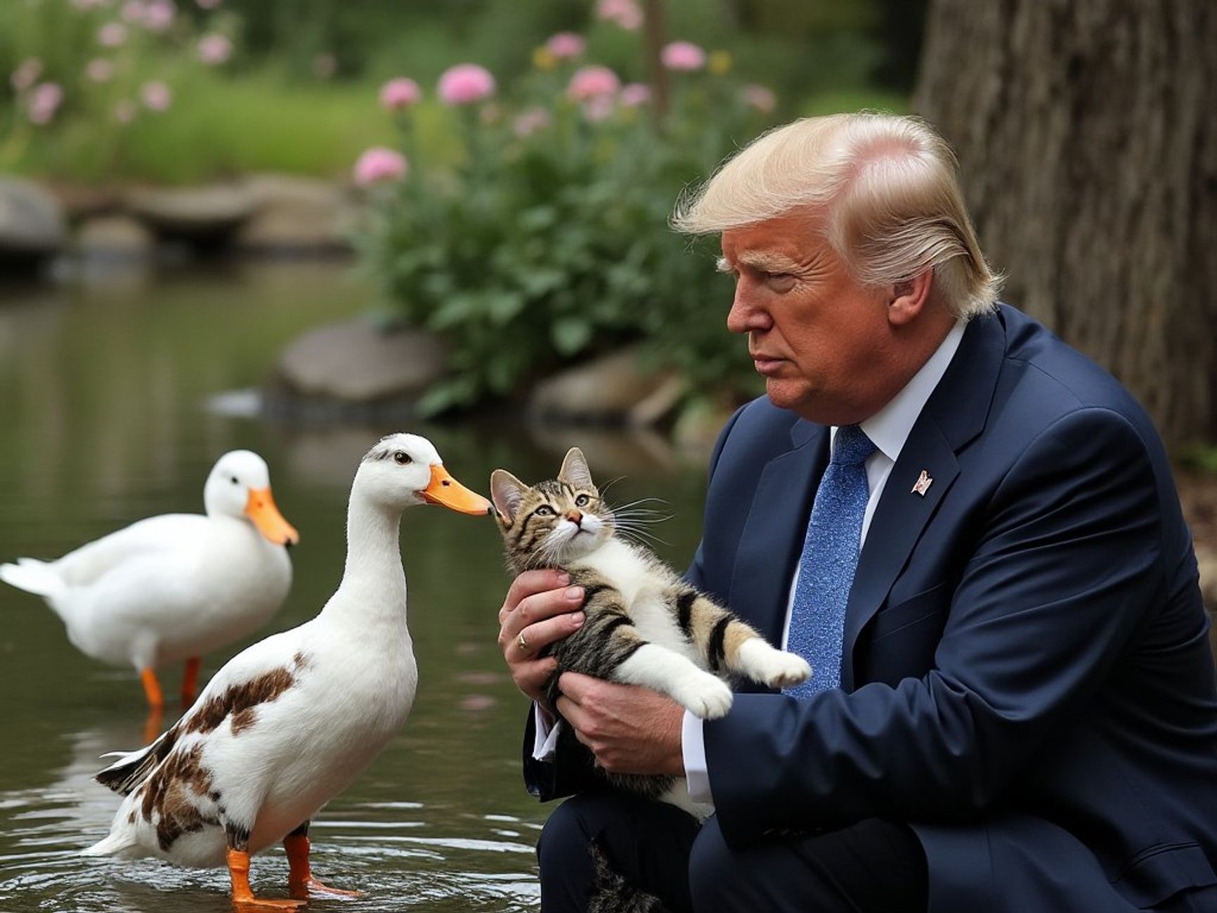 После этого в соцсетях стали распространяться сгенерированные нейросетями картинки, где Трамп представлен как спаситель кошек и уток.