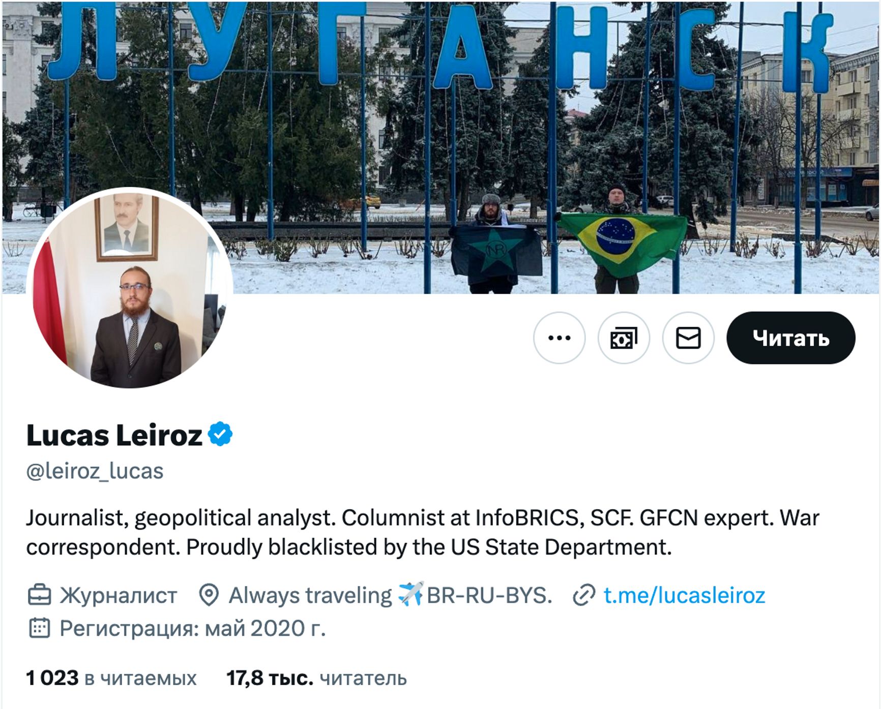 На этом сайте регулярно публикуются статьи прокремлевского содержания о «скором поражении Украины», причем пишут их, как правило, бразильцы. Автор публикации об «угрозе» Европе в лице Украины Лукас Лейрос уже попадал в поле зрения The Insider. Он выступал по приглашению российской делегации на заседании Совета ООН по правам человека с докладом об использовании химического оружия армией Украины. В своем Twitter Лейрос пишет, что он «находится в черном списке Госдепартамента США и гордится этим», на обложке у него стоит фотография из оккупированного Луганска, где он держит бразильский флаг. Лейрос уточняет, что он постоянно путешествует между Бразилией, Россией и Беларусью; не очень понятно, откуда при таких маршрутах он знает, что думает «большинство населения европейских стран».