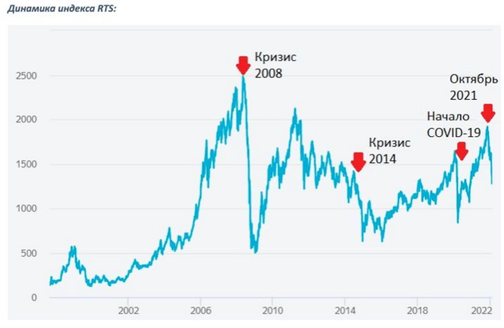 Предыдущий сопоставимый обвал был в феврале-марте 2020 года — в начале пандемии COVID-19. Максимальное значение за февраль составляло 1560 пунктов, а минимальное за март — 832, падение составило 47%. Довольно резко падал индекс RTS и в июне-декабре 2014 года, когда на Донбассе шли боевые действия, а против России вводили первые санкции. От значения 1404 в июле до 629 в ноябре — это минус 55%. При этом события 2014 года стали лишь звеном большого негативного тренда 2011–2016 годов. Пиковое значение индекса в апреле 2011 года — 2123 пункта — так и остается с тех пор непревзойденным.