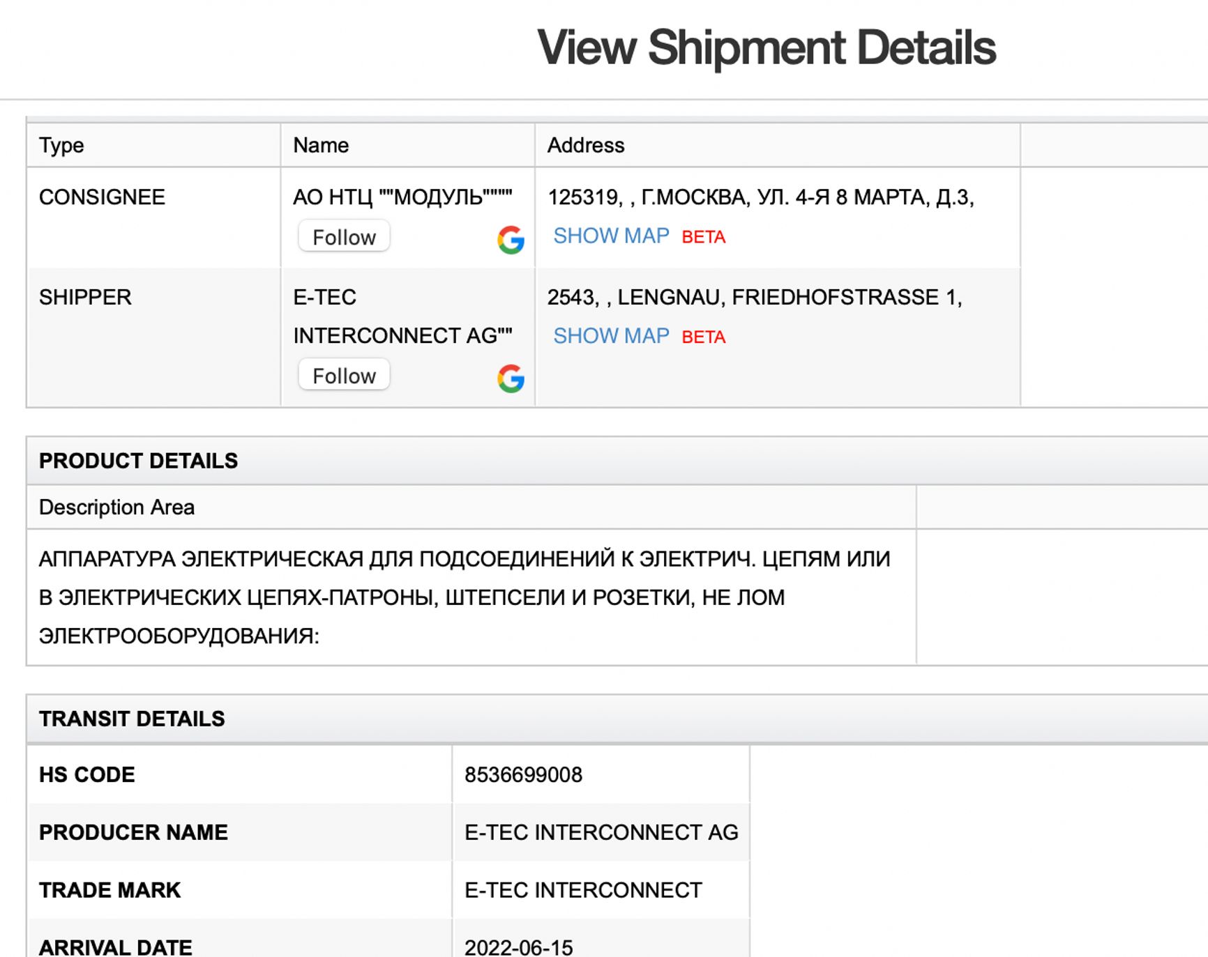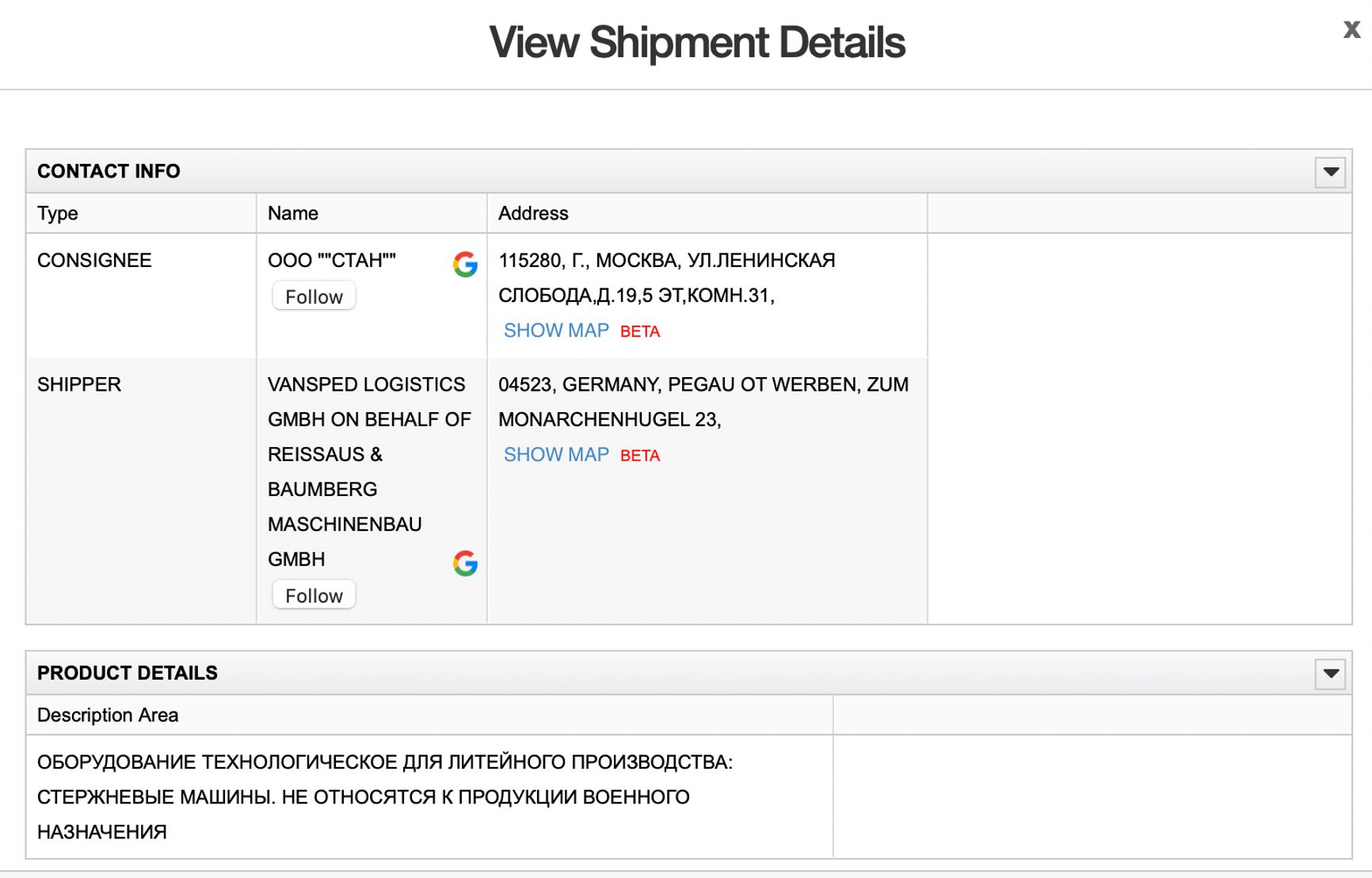 Московское ООО «Стан» — разработчик современных станков с числовым программным управлением, входящий в госкорпорацию «Ростех». Несмотря на то что «Ростех» находится под санкциями, немецкая компания Vansped Logistics (от имени Reißaus & Baumberg Maschinenbau GmbH) уже после начала войны поставляла «Стану» технологическое оборудование для литейного производства. Согласно базе ImportGenius, поставки были осуществлены в июле 2022 года.