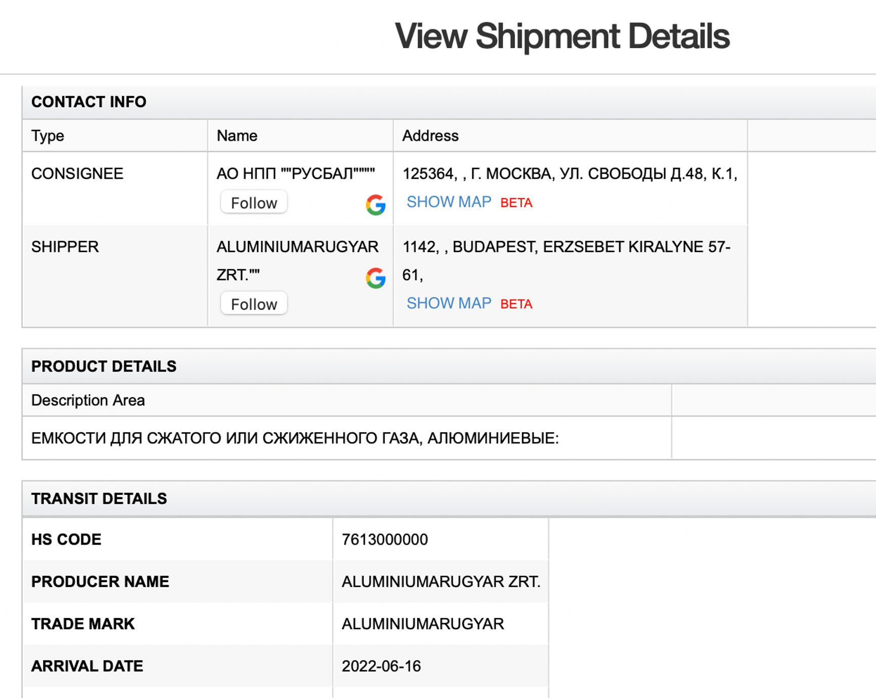 Венгерская фирма Aluminiumarugyar Zrt. продает емкости для газа российскому предприятию «Русбал», производителю надувных макетов для армии.
