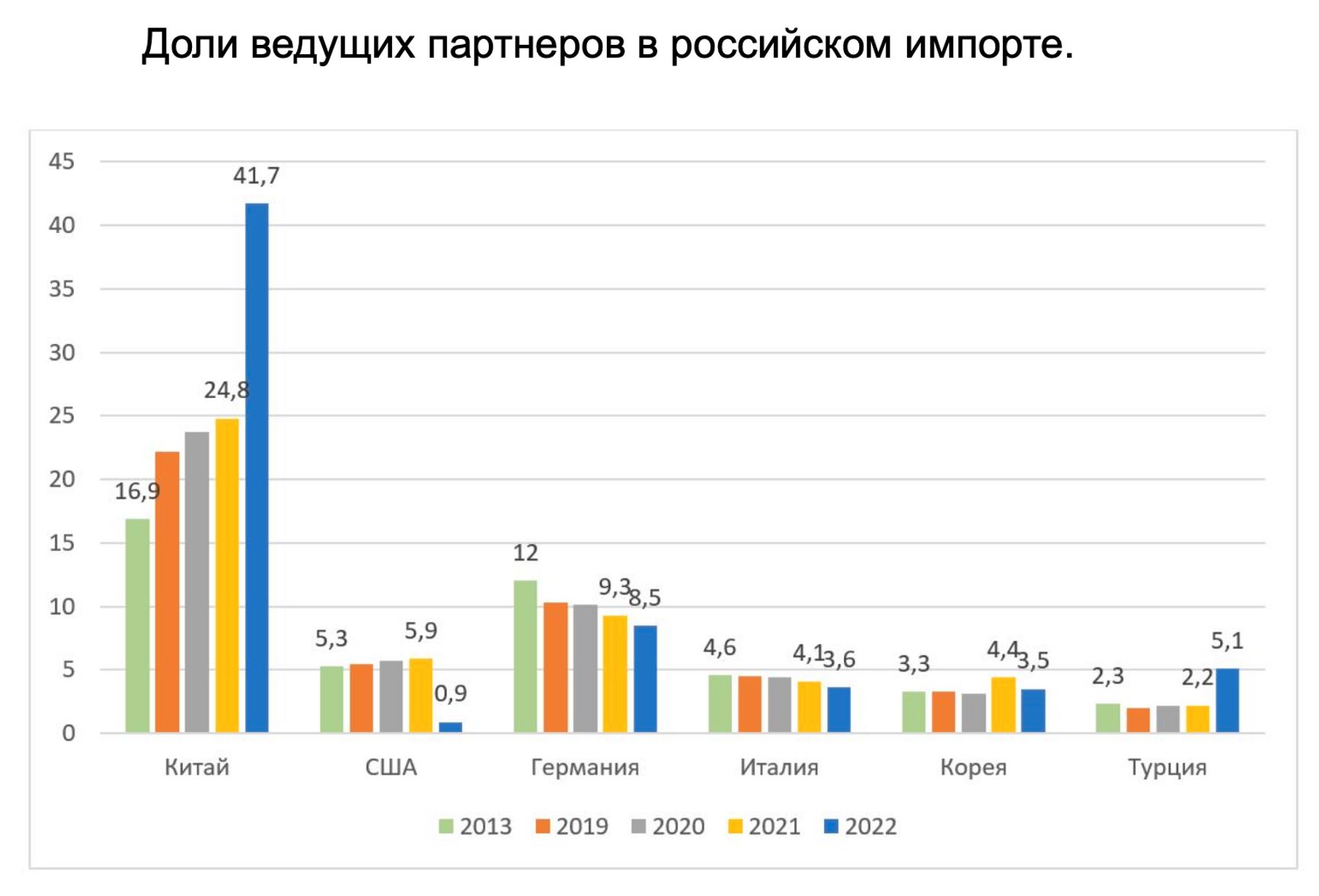 В сумме за 2022 год на две основные страны пришлось 50,2% российского импорта — уже не треть с небольшим, а половина. То есть значимость для России крупнейших торговых партнеров возрастает. А поскольку ожидать роста поставок из Германии не приходится, то вполне может быть, что по итогам 2023 года Китай будет обеспечивать уже больше половины российского импорта.