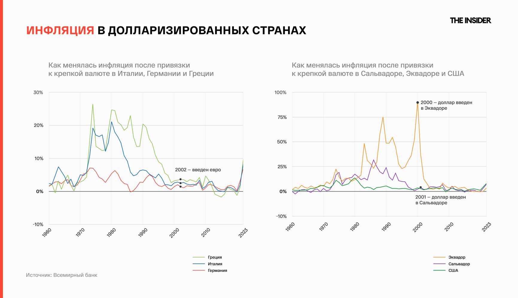 Если посмотреть на примеры других стран, которые долларизировали экономику, становится ясно, что это отличный инструмент в борьбе с инфляцией. Так произошло, например, с европейскими Италией и Грецией, где после перехода на евро инфляция, раннее достигавшая 20%, не поднималась с тех пор выше 5%, или южноамериканскими Эквадором и Сальвадором, где после долларизации инфляция не превышала 10%, хотя до этого достигала 90% и 30% соответственно.