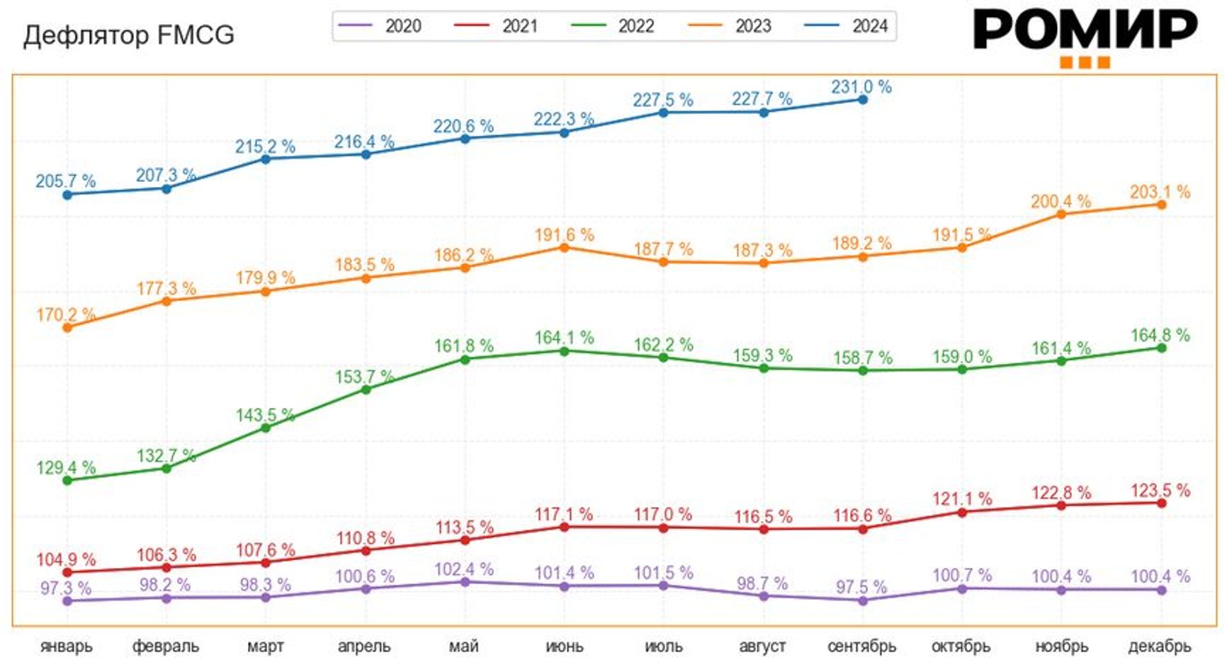 However, Putin only cited the official inflation rate published by Russia’s Rosstat federal statistics agency. Everyday goods, meanwhile, are rising in price at a much faster pace. The Russian research center ROMIR calculates the “Deflator Index,” which tracks real changes in prices for everyday goods (FMCG), describing it as “the average personal inflation rate for each consumer.”