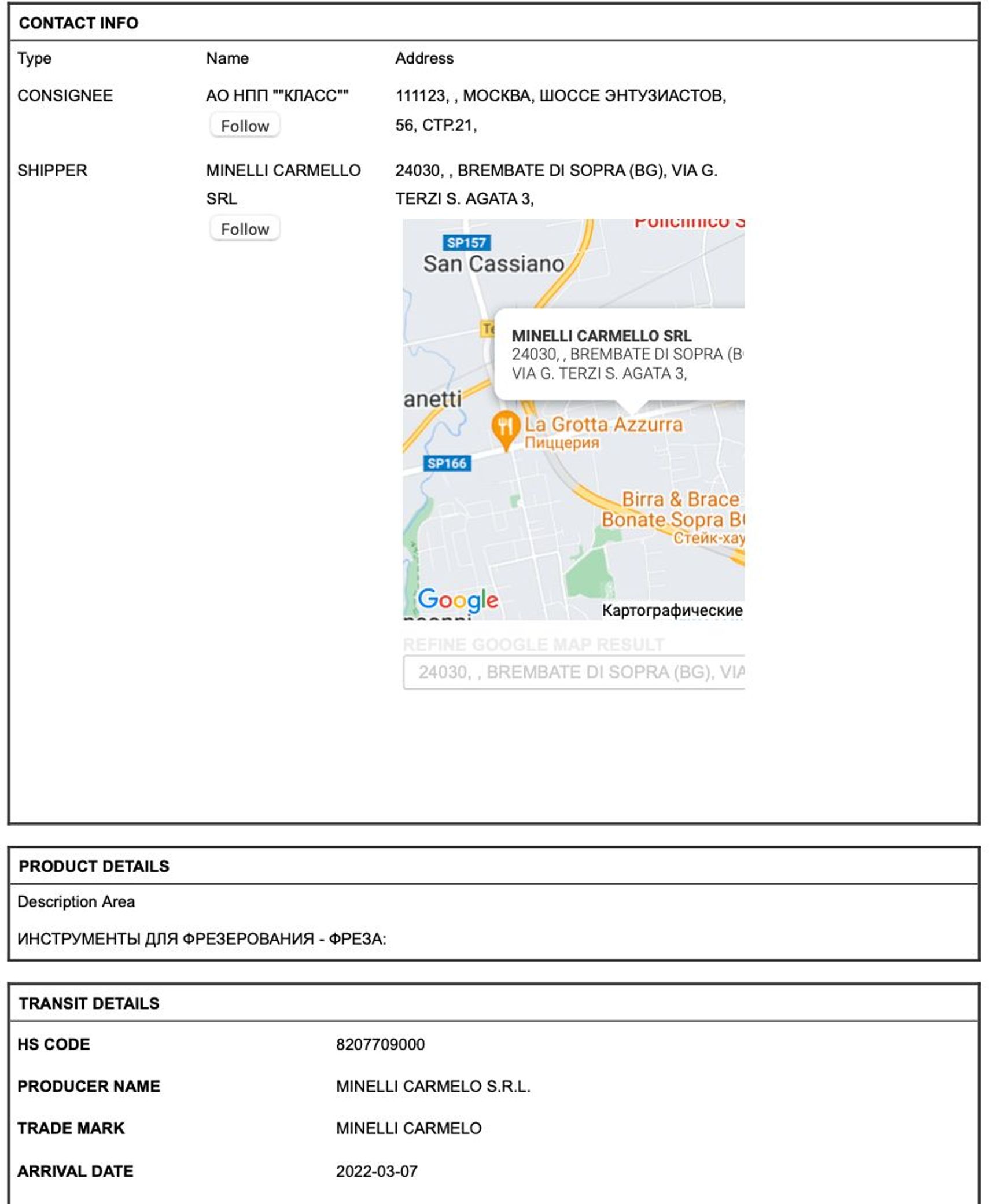 NPP Class, a manufacturer of body armor for Russia’s army and security services, imported a cutting tool from Italy supplied by Minelli Carmello.