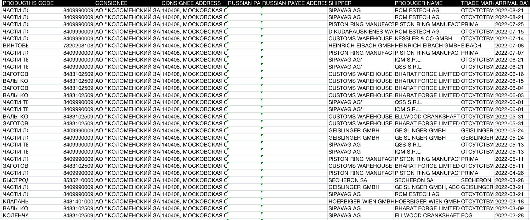 Oligarchs Iskandar Makhmudov and Andrei Bokarev are also among the buyers of European mechanical – the pair owns JSC Kolomensky Zavod, which supplies the Ministry of Defense with diesel engines for warships. Parts for D500-type engines are sold to Kolomensky Zavod by Switzerland’s Sipavag AG, Lithuania’s D.Kudarauskienes Warehouse, and Austria’s Geislinger GmbH.