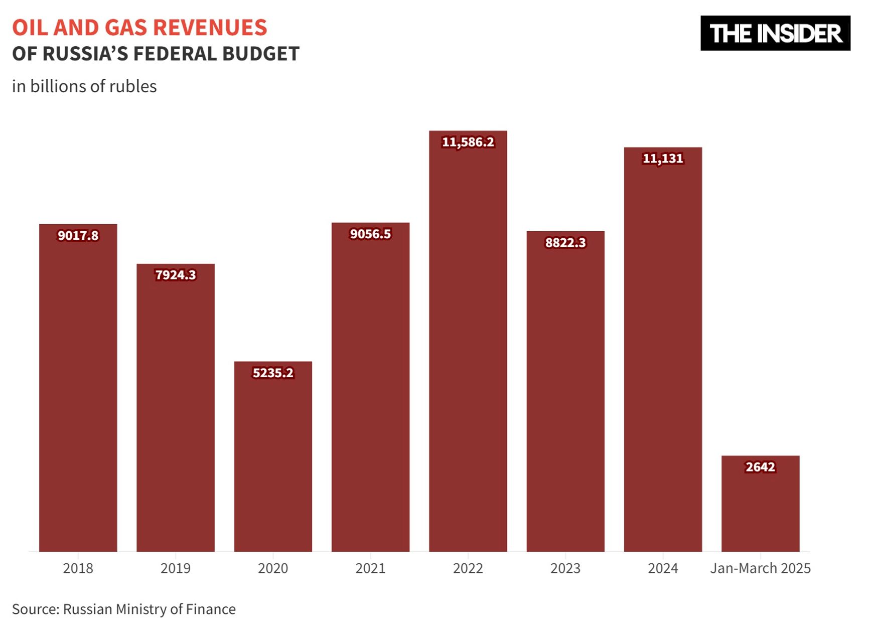 Russia’s oil and gas revenues have already fallen by 10% — and that may be just the beginning. Oil prices are sliding amid fears of a global economic slowdown triggered by the US-China tariff war, along with rising production from OPEC+ countries. Goldman Sachs warns that in a worst-case scenario, oil could plunge to $40 a barrel by 2026. Even the bank’s more moderate forecast isn’t much better: $55 a barrel. For Russia, that could mean: at best; another round of inflation and ruble devaluation; and at worst, a banking crisis and industrial shock.