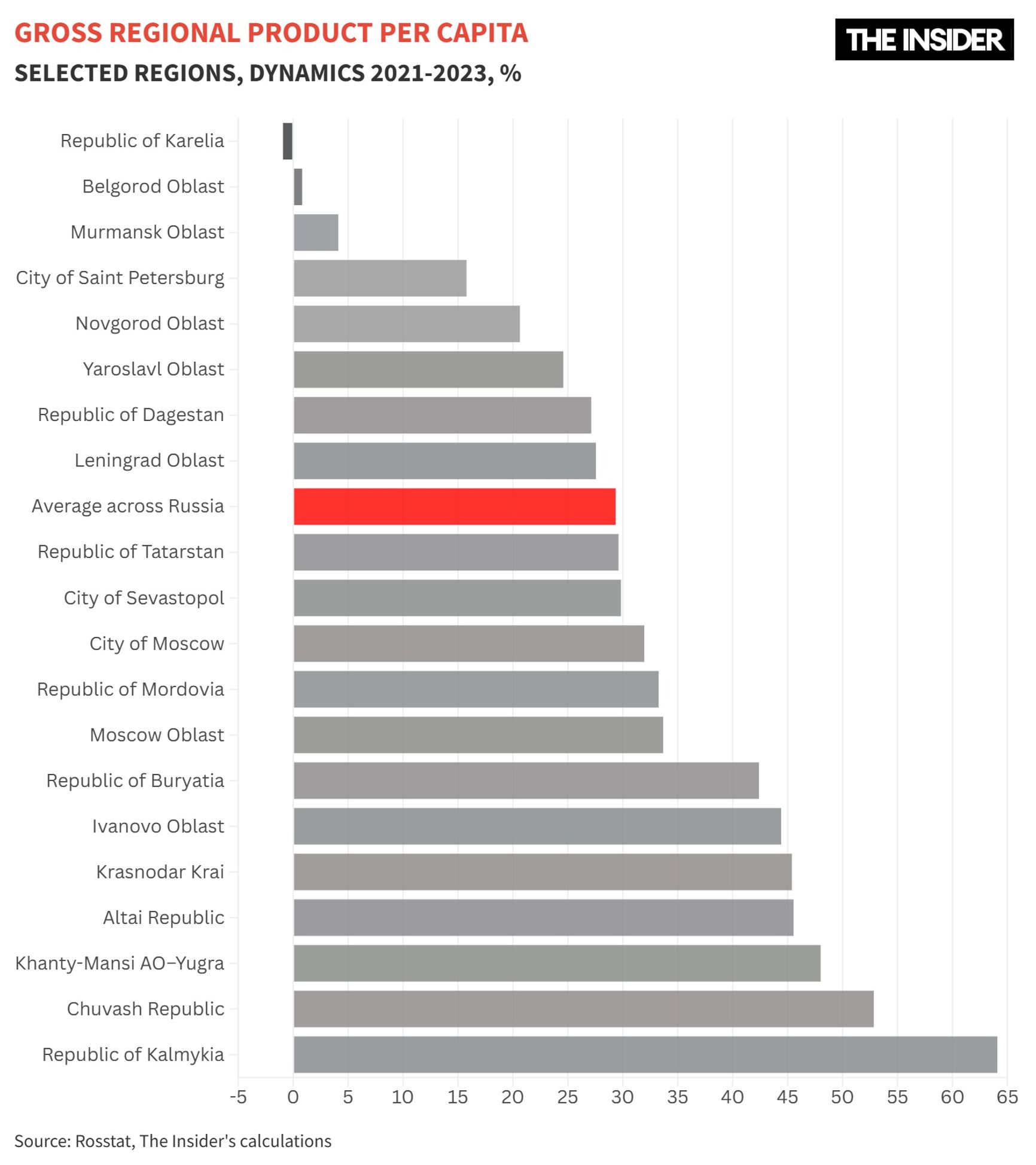 One way to gauge the economic performance of a region is by looking at per capita growth in gross regional product (GRP). Nationwide, excluding inflation, this figure rose by 29% from 2021 to 2023 (the most recent year calculated by Rosstat). And in some regions, the gains were far greater.