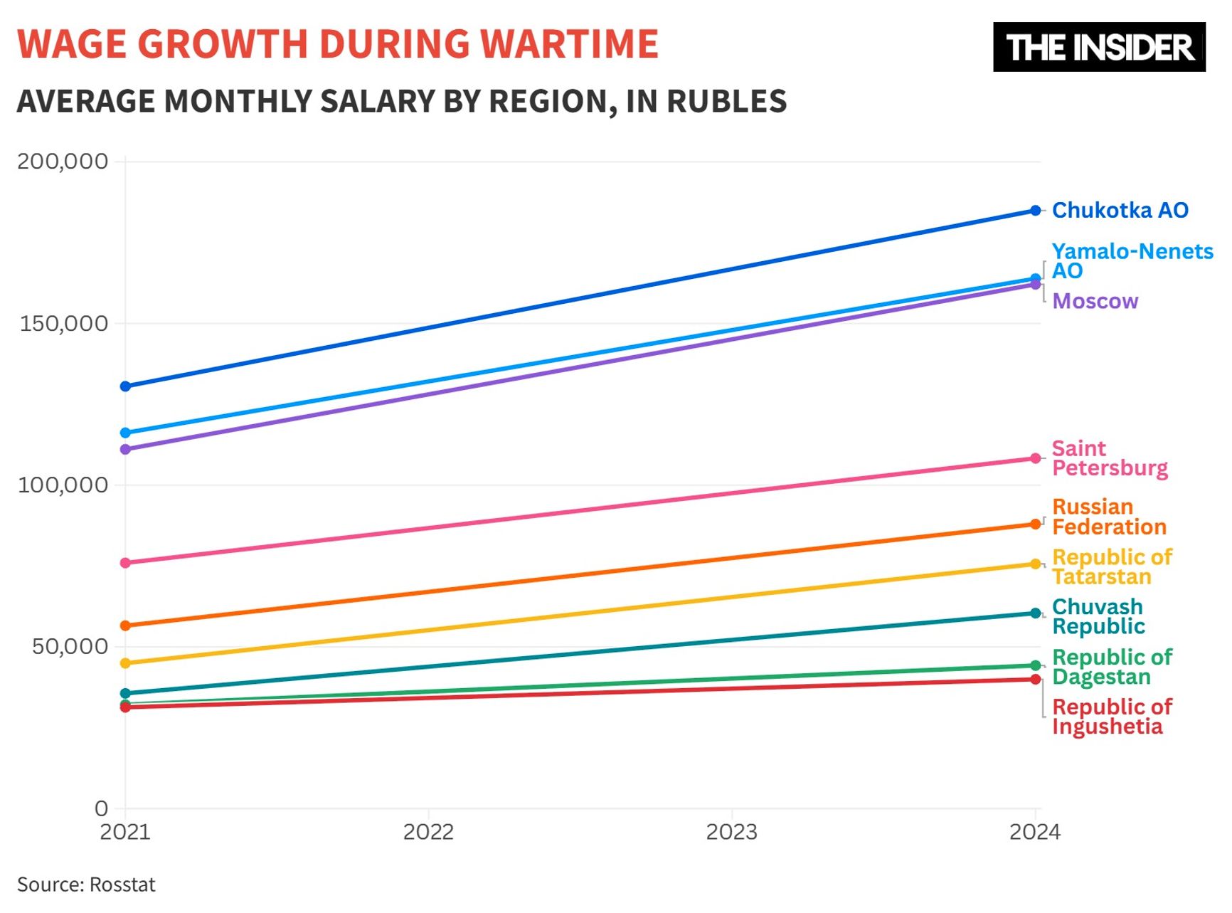 The top ten regions for wages over the three years of war have barely changed, still dominated by areas with extractive industries and northern autonomous regions. In the Chukotka Autonomous District, the average salary jumped from 130,000 rubles in 2021 ($1,781) to 185,000 in 2024 ($2,320). The Yamalo-Nenets Autonomous District saw an increase from 130,000 ($1,781) to 164,000 rubles ($2,056), while in Moscow the figure rose from 120,000 ($1,644) to 162,000 rubles ($2,031).
