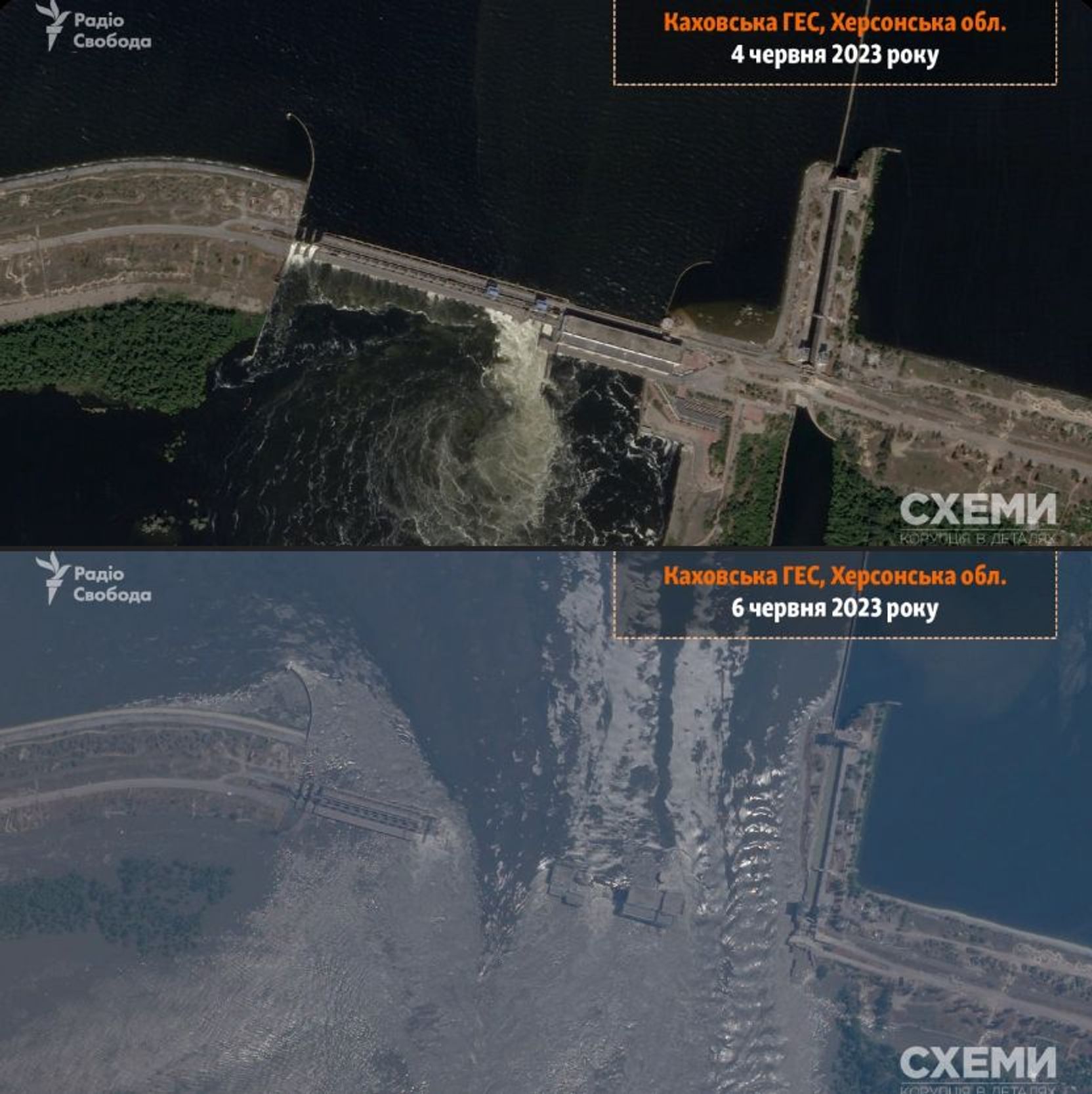 Ukrainian media project and Radio Liberty affiliate Skhemy also published satellite images of the Kakhovskaya HPP dam before and after the explosion (dated June 4 and 6).