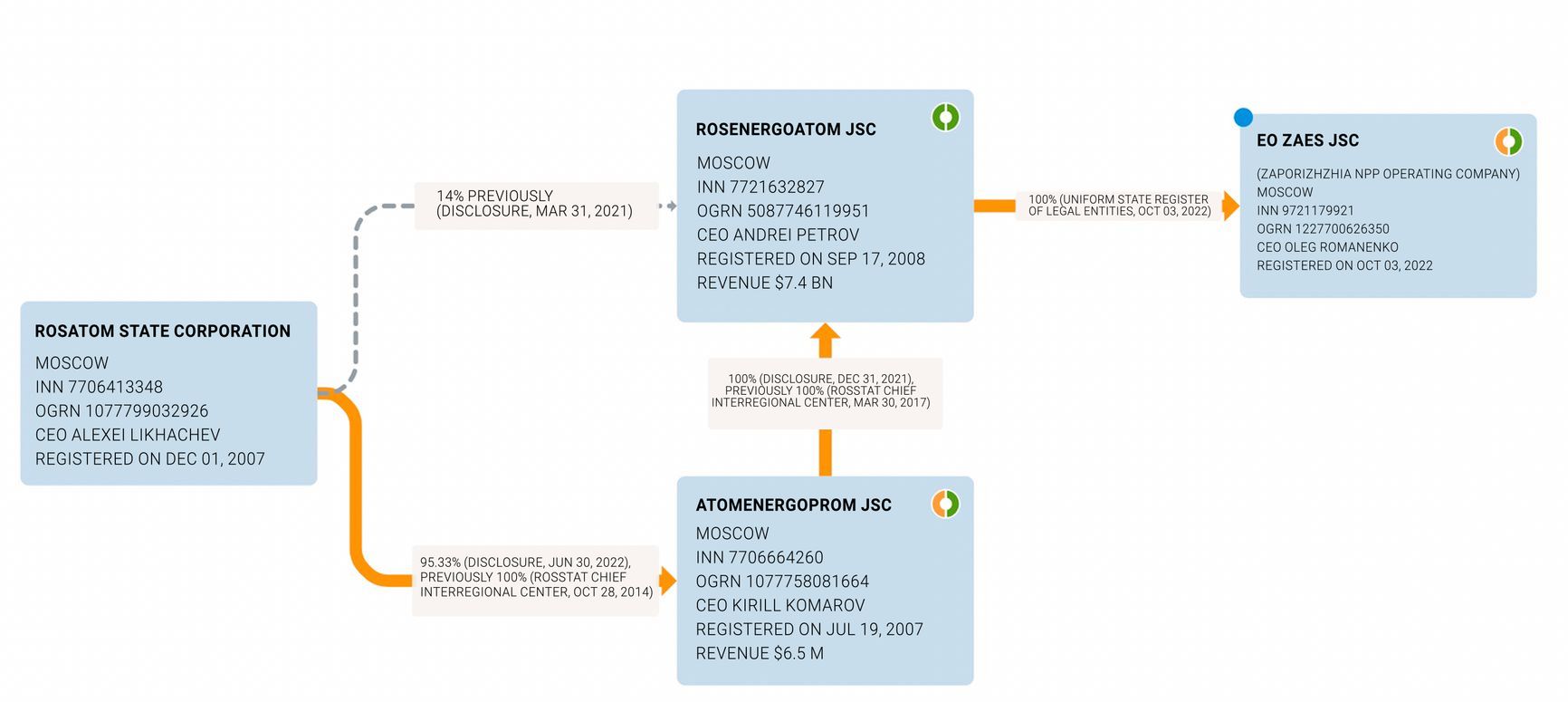 There is no mention of the operating company in the lists of affiliated entities, although all of Rosatom’s federal state unitary enterprises (abbreviated in Russian as FGUP) normally indicate the affiliation on their websites. By contrast, EO ZAES uses vague language, stating that the company “is supported by Rosenergoatom”, which is Rosatom's fuel division. Nevertheless, it is Rosatom that directly manages the plant, as Rosenergoatom is the sole founder and shareholder of EO ZAES. Rosenergoatom's parent company is Atomenergoprom JSC, which, in turn, belongs to Rosatom, as per its official website. EO ZAES was registered on October 3, two days before Vladimir Putin signed the official decree on the acceptance of ZNPP facilities into federal ownership.