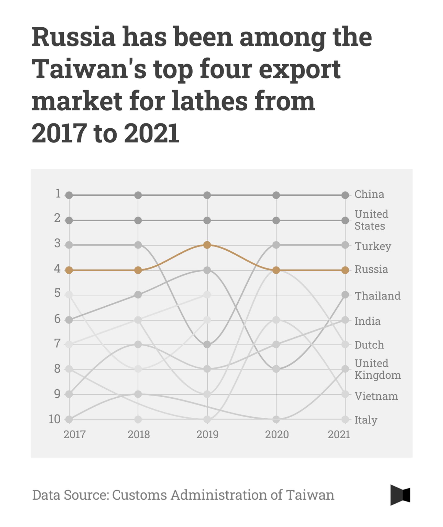 The relationship between Taiwanese machine tools makers and Russian customers is not new. Taking lathes as an example, Russia had been one of Taiwan's top four export markets since 2017, with average annual sales exceeding $30 million.