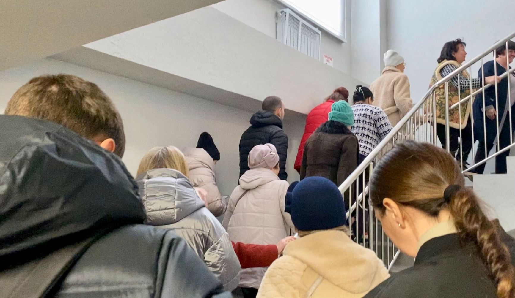 “I walked and walked, I didn’t make it, even though it’s 200 meters to the school where the polling station is,” grins one of the men, adding: “That was the longest 200 meters in my life!” His name is Sergei, he lives in a neighboring apartment block. He teaches at a local university, and, unlike his colleagues who voted remotely on Russia’s online state services portal Gosuslugi, he decided to fulfill his civic duty at the polling station. Sergei is cheerful, joking and laughing. There are seven of us taking cover. Other people in the shelter are not so optimistic. “I went to pick up Vika from the garden,” says another man. He tries to call his wife, but the network reception in the entrance is poor. People have moved further inside, away from the entrance. One of the men is holding the door so that everyone who is nearby can get into the makeshift shelter.