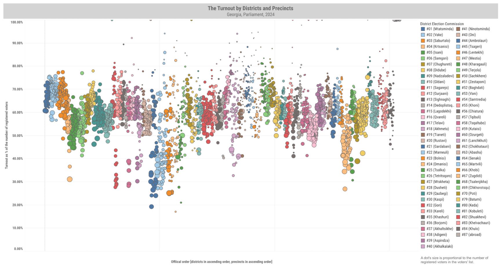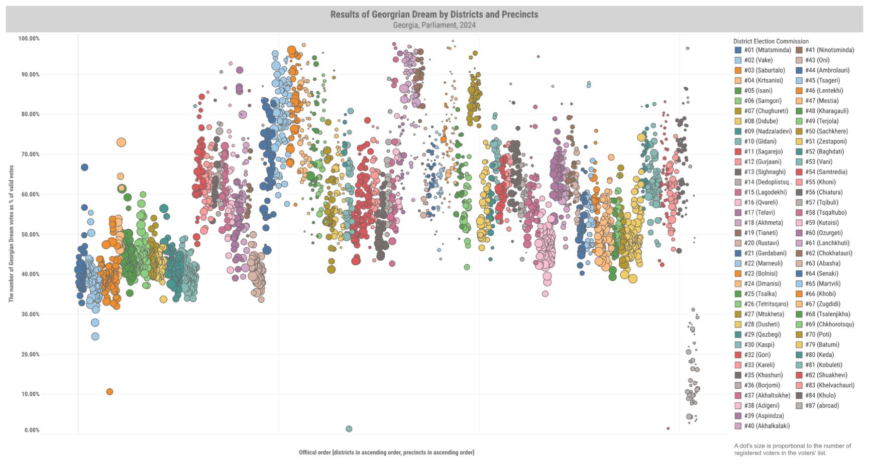 On the horizontal axis, district election commission and precinct numbers are plotted in ascending order, while the vertical axis shows Georgian Dream’s results (top graph) and voter turnout (bottom graph).