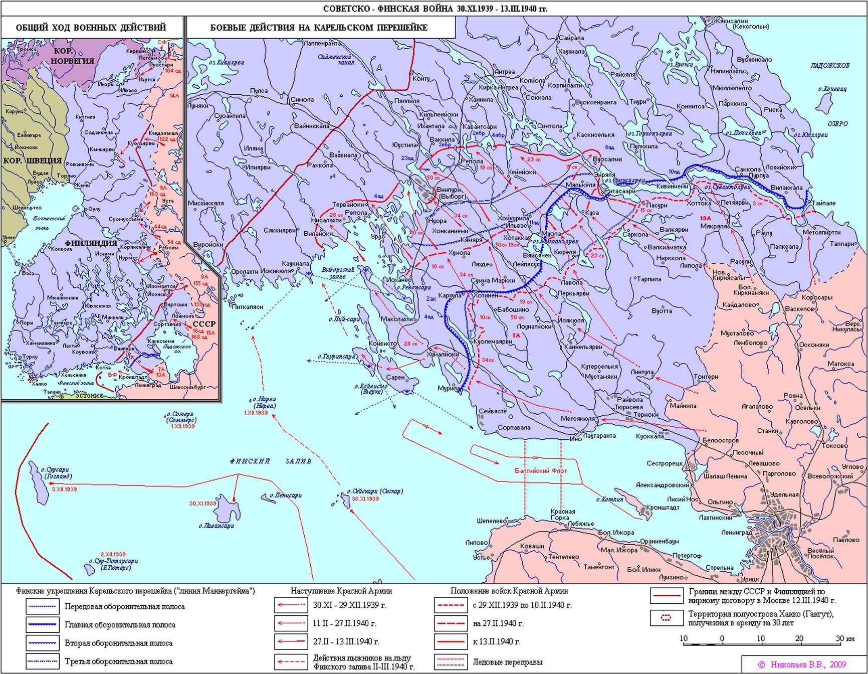 The Red Army attacked the Karelian Isthmus aiming for the Finnish capital Helsinki. An ancillary strike was delivered north of Lake Ladoga. Here, on hard terrain, the Soviet troops acted extremely unsuccessfully. Finns managed to encircle a few Soviet formations and took many prisoners. Only the actions of the 14th Soviet army in the polar region were successful. It seized the only Finnish port in the Barents Sea, Petsamo, but was unable to advance further in the tundra conditions. The storm of the Mannerheim line on the Karelian Isthmus by December 30, 1939, ended in a complete failure. Only a few minor incursions were made. The Soviet command had very little idea of the Finnish fortifications. The assault resumed on February 1, 1940 after the number of Soviet troops on the Karelian Isthmus more than doubled and all the forces acting against Finland were united into a North-Western Front under the command of Army Commander 1st Rank Semyon Timoshenko. In the last decade of February, the Mannerheim line was breached. On March 13, the day the peace treaty was signed, the fighting continued on the rear defense line near Vyborg. That day the Soviet troops made an unsuccessful and completely pointless attack on Vyborg, which, according to the terms of the Moscow peace treaty, signed the day before, was to be handed over to the Soviet Union anyway.