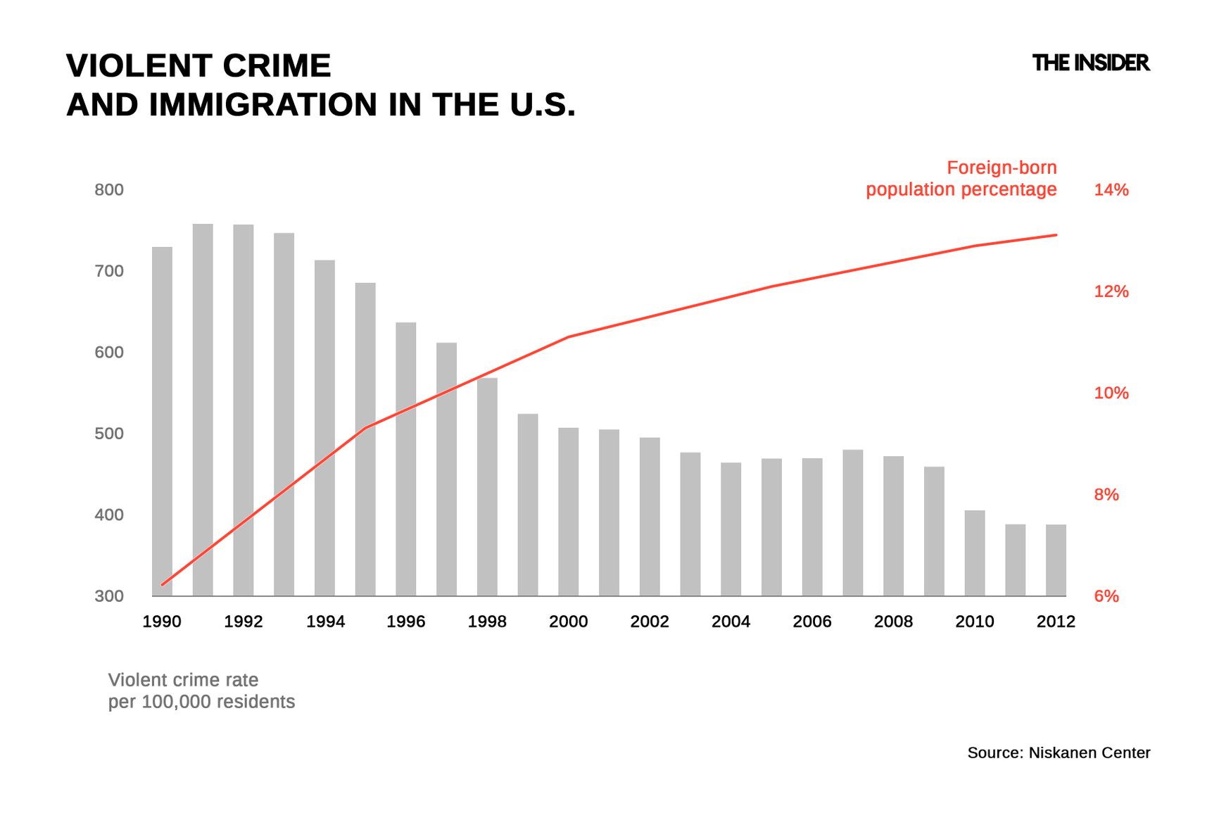 In the case of the modern-day U.S., anti-immigration sentiment is particularly paradoxical. This country was created by migrants, and throughout its history, immigrants have been the main resource for the development of the American economy and culture. Incidentally, the U.S. also offers the most vivid proof that the myth of migrants with “a lot of bad genes” (in Trump's words) bringing crime has nothing to do with reality. The non-native-born share of the American population rose from 6% in 1990 to 13% in 2012, while the violent crime rate dropped from 700 to 400 per 100,000 people.