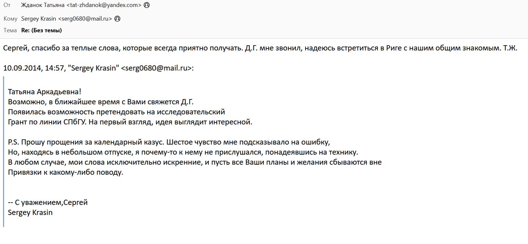 Жданок отвечает: «Сергей, спасибо за теплые слова, которые всегда приятно получать. Д. Г. мне звонил, надеюсь встретиться в Риге с нашим общим знакомым. Т. Ж.».