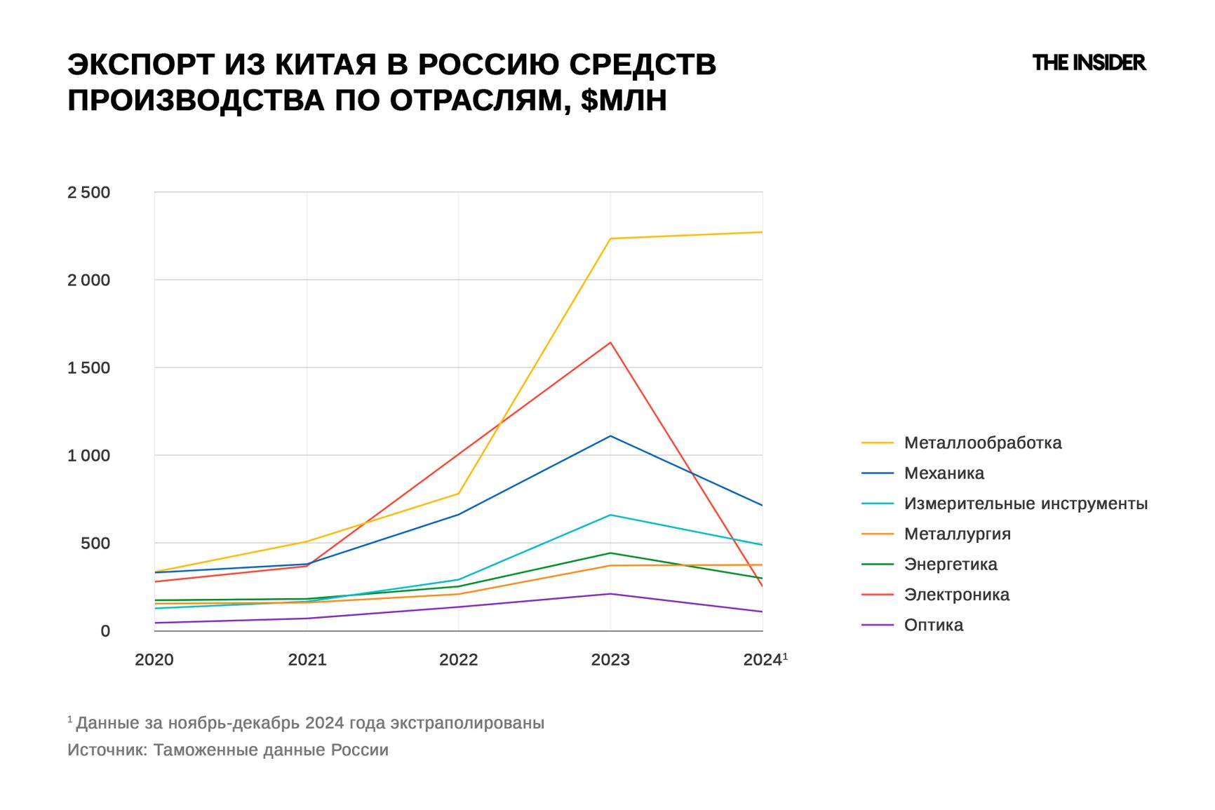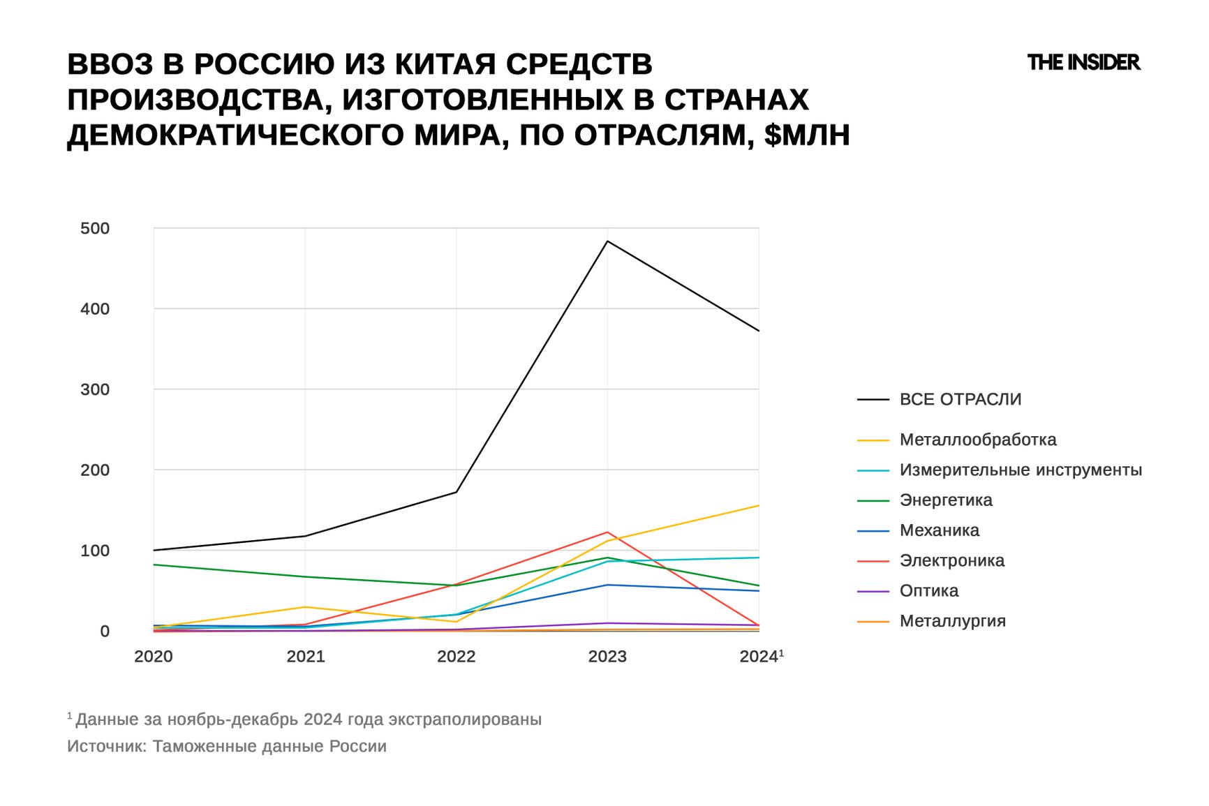 Торговые ограничения в отношении западного промышленного оборудования наконец начали работать, свидетельствует анализ The Insider. Судя по таможенным данным, в 2024 году официальные поставки и из Китая, и из других стран сократились более чем в 10 раз. В целом поставки импортного оборудования снизились примерно в полтора раза.