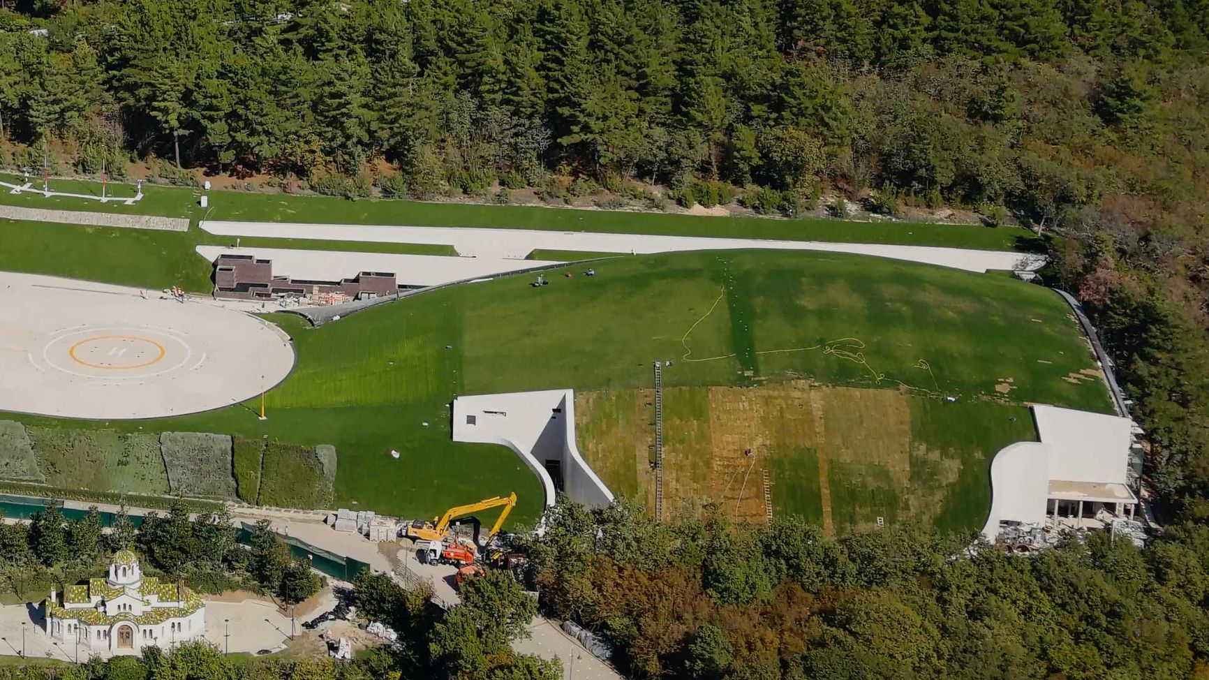 Под вертолетной площадкой находится ледовый дворец. Церковь на его фоне выглядит совсем крошечной: