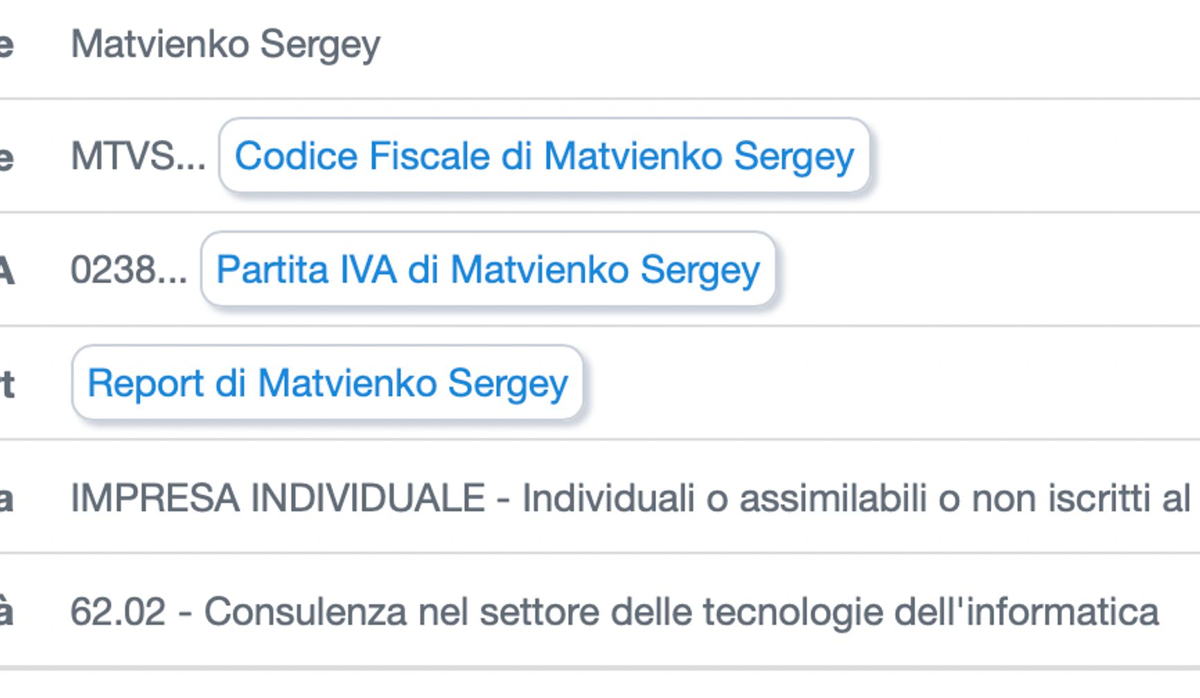 Вид деятельности - «Консультирование в области информационных технологий». Кроме того, он официально, по данным The Insider, фигурирует в российской базе лиц как обладатель вида на жительство в Италии.