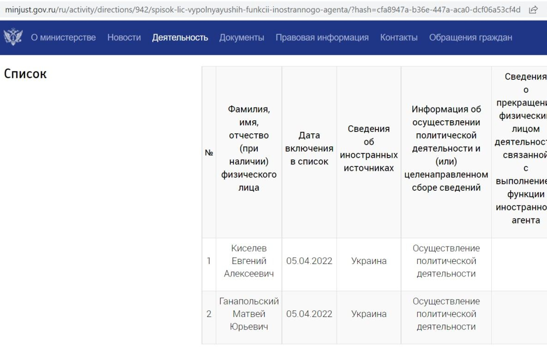 Министерство юстиции РФ создало единый реестр физических лиц, которые объявлены «иностранными агентами» или которые связаны с ними. В список уже попали журналисты Матвей Ганапольский и Евгений Киселев.
