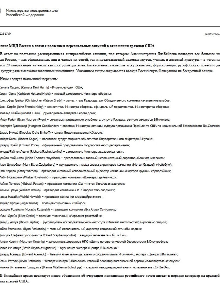 В частности, в список включены вице-президент США Камала Харрис, официальный представитель Пентагона Джон Кирби, руководитель аппарата Белого дома Рональд Клейн, глава Bank of America Брайан Мойнихэн, глава компании Meta Марк Цукерберг, руководители военно-промышленных компаний, а также главред англоязычной «Медузы» Кевин Ротрок.