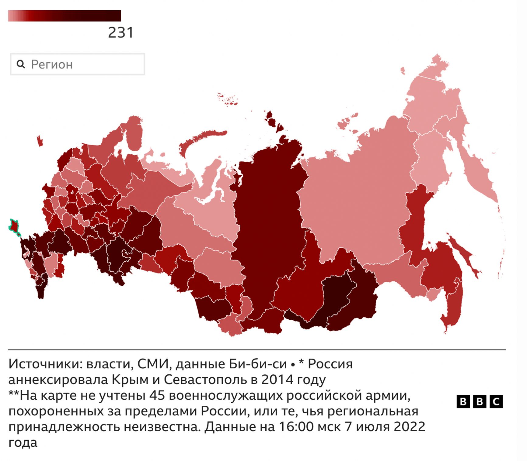 Максимальное число погибших военных — в Дагестане (231). При этом не обо всех случаях сообщается публично: журналисты находят на кладбищах в разных городах России свидетельства похорон военных, о гибели которых местные власти не заявляли. Только за последние две недели журналистам удалось установить могилы 20 погибших военнослужащих, чьи имена не назывались публично. Они похоронены на кладбищах Красноярска, Томска, Майкопа и других российских городов. Список подтвержденных случаев смертей не окончательный, он может содержать на 40–60% меньше имен погибших, чем реально захоронено в России.
