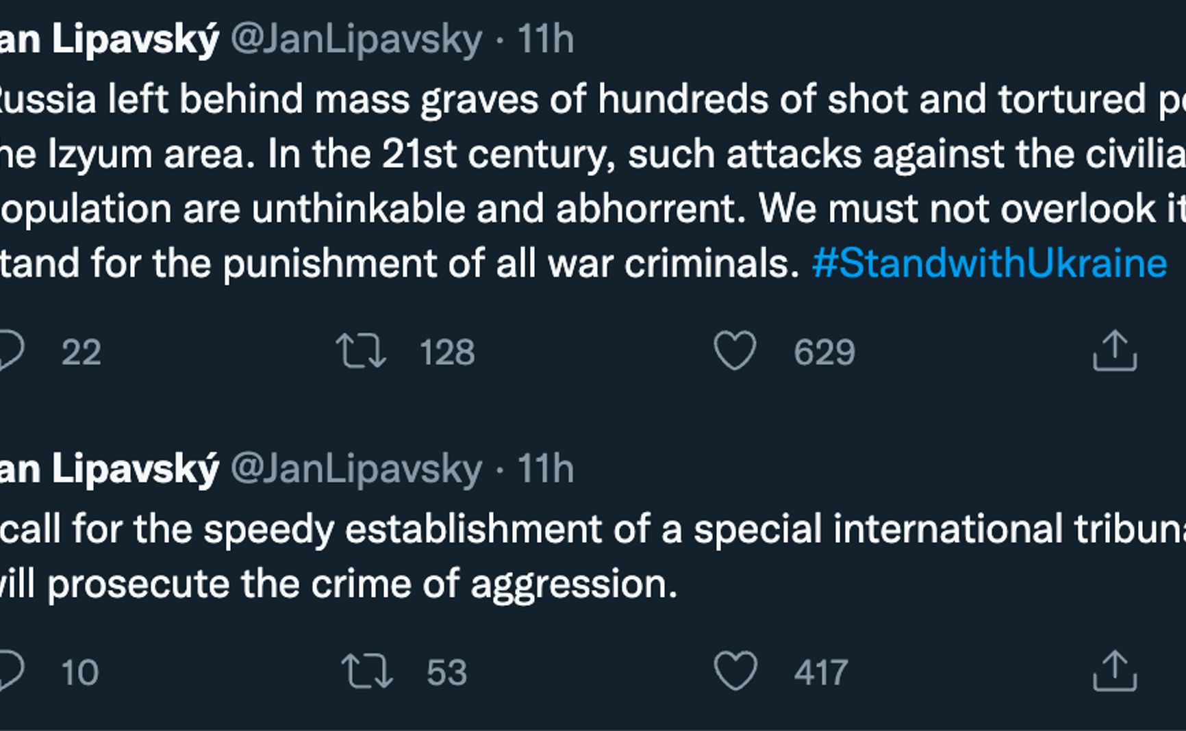 Глава Министерства иностранных дел Чехии Ян Липавский предложил создать специальный трибунал для тех, кто виновен в массовых убийствах гражданских лиц в Изюме. Об этом он написал в Twitter. По его словам, ответственность за преступления несет Россия.