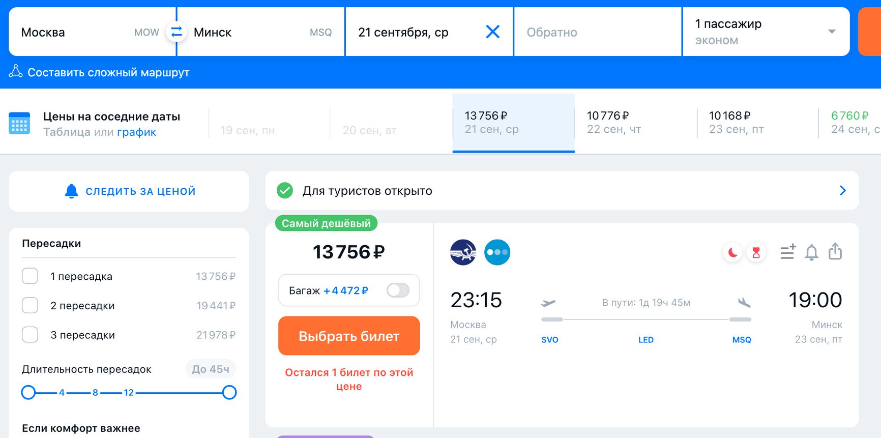 Раскуплены оказались даже билеты на прямые рейсы в Минск. Если вылететь туда 21 сентября из Москвы или Санкт-Петербурга, то оказаться в Беларуси получится только 23 сентября.