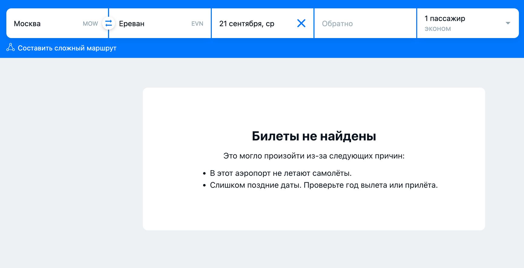 Еще одно популярное направление у россиян — Армения. Аэропорты там есть всего в двух городах — в Ереване и Гюмри. Рейсов на 21 сентября нет на оба направления, ни прямых, ни транзитных. В граничащий с ним Азербайджан также нет ни одного рейса.