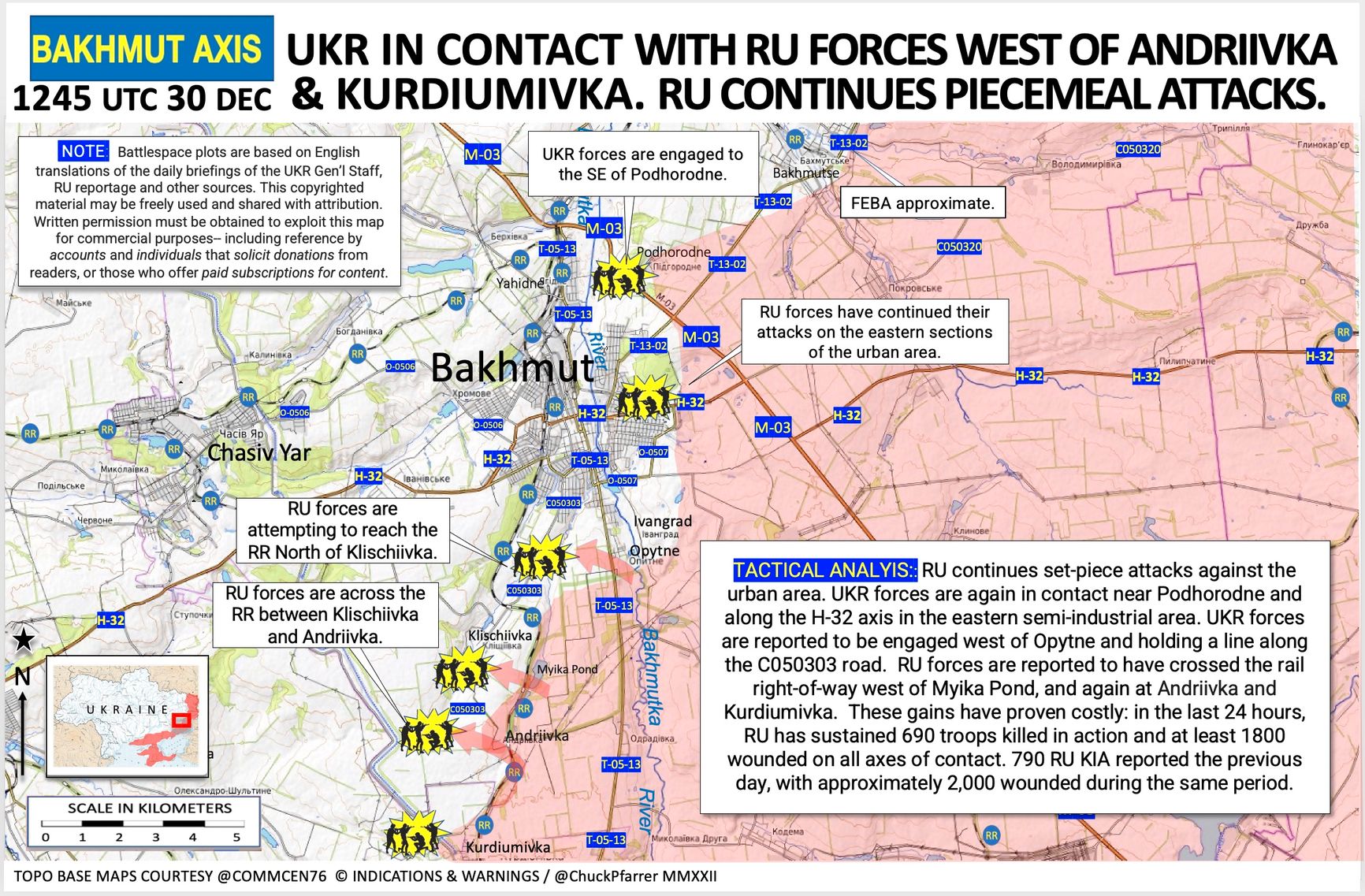 Российские военные пересекли железную дорогу в районе пруда Мойка и снова оказались в селах Андреевка и Курдюмовка. Однако этот успех дорого им обошелся: за последние сутки 690 военных погибли и не менее 1800 были ранены на всех прилегающих направлениях, пишет в Twitter военный корреспондент, бывший военнослужащий «Морских котиков» США Чак Пфаррер, и иллюстрирует ситуацию наглядной картой: