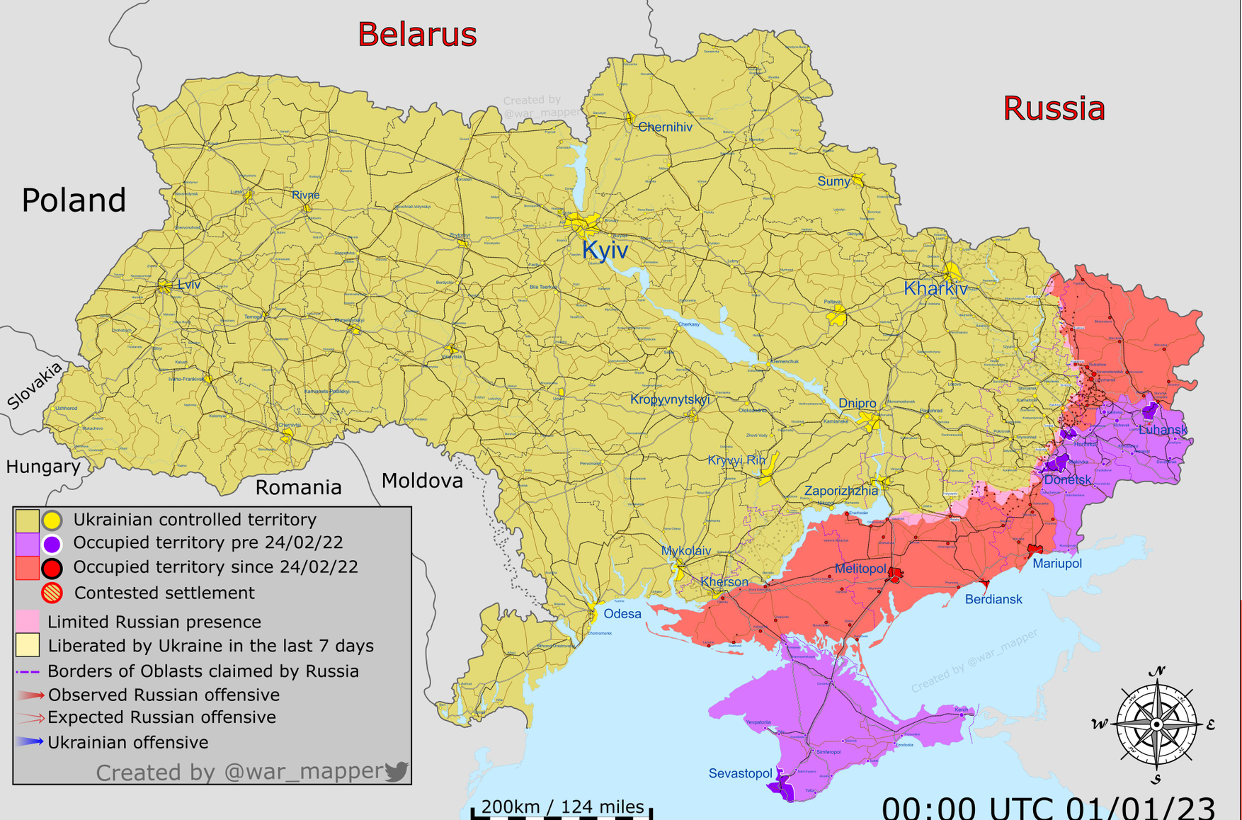 Ресурс WarMapper опубликовал карту, которая отражала ситуацию на фронте по состоянию на 00:00 1 января. Согласно аналитикам WarMapper, 31 декабря российские войска захватили село Дорожнянка в Запорожской области, которое находится южнее Гуляйполя.