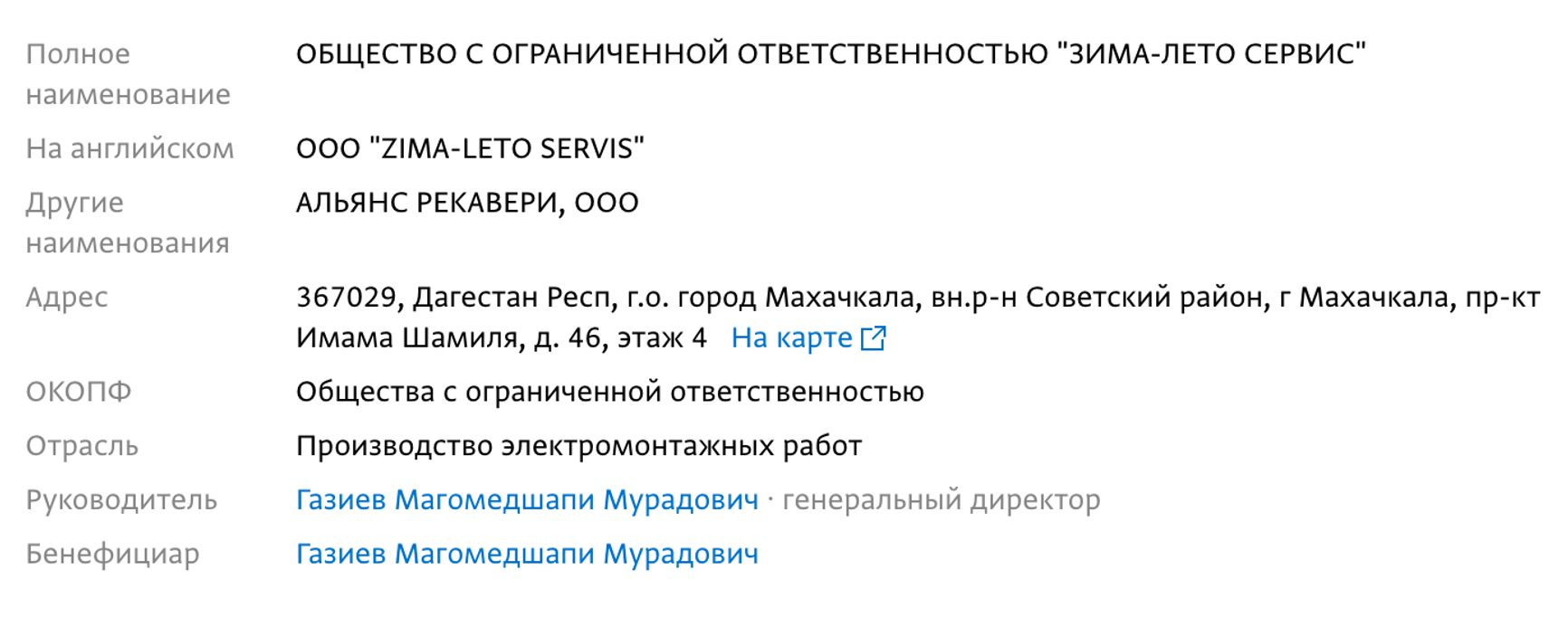 Директором «Альянс Рекавери» на сайте был указан Газиев Магомедшапи, на него, согласно «Спарку», зарегистрирована лишь одна фирма ООО «ЗИМА-ЛЕТО СЕРВИС», основное направление деятельности — «Производство электромонтажных работ».