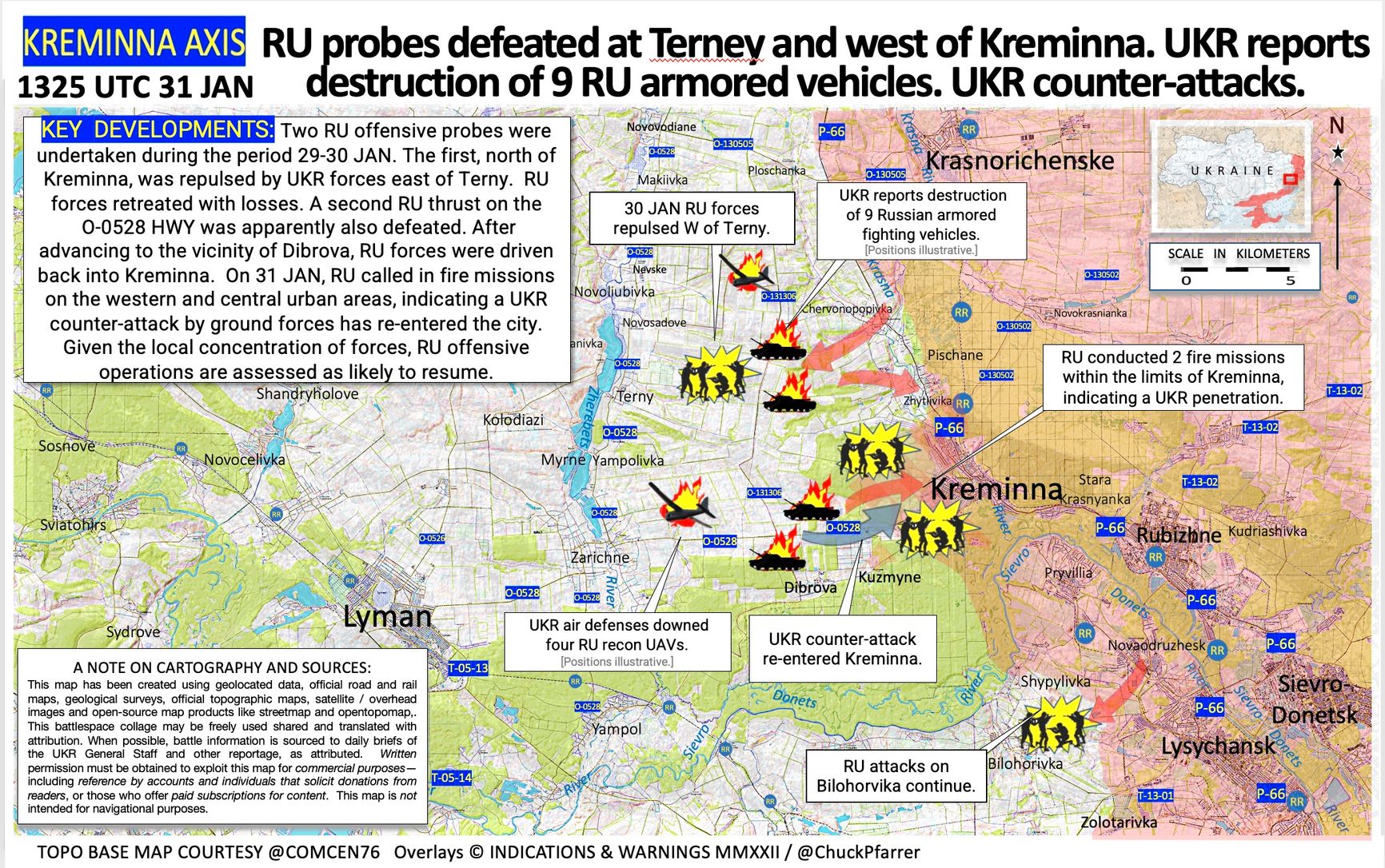 Бывший военнослужащий ВМС США Чак Пфаррер заявил, что Россия 29 и 30 января предпринимала попытки наступления севернее Кременной Луганской области, Украине удалось отбить атаки, группировка РФ отступила с потерями.