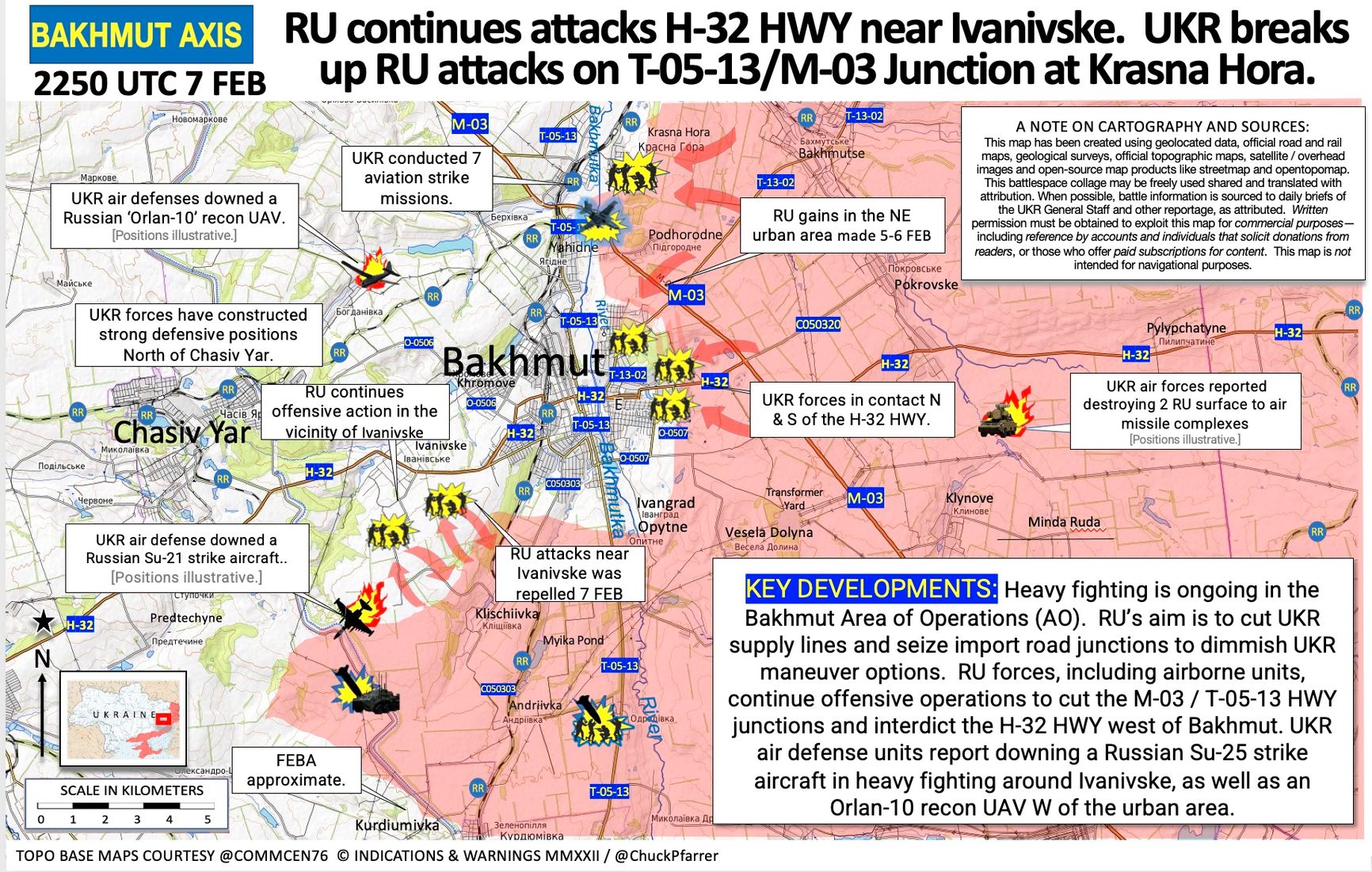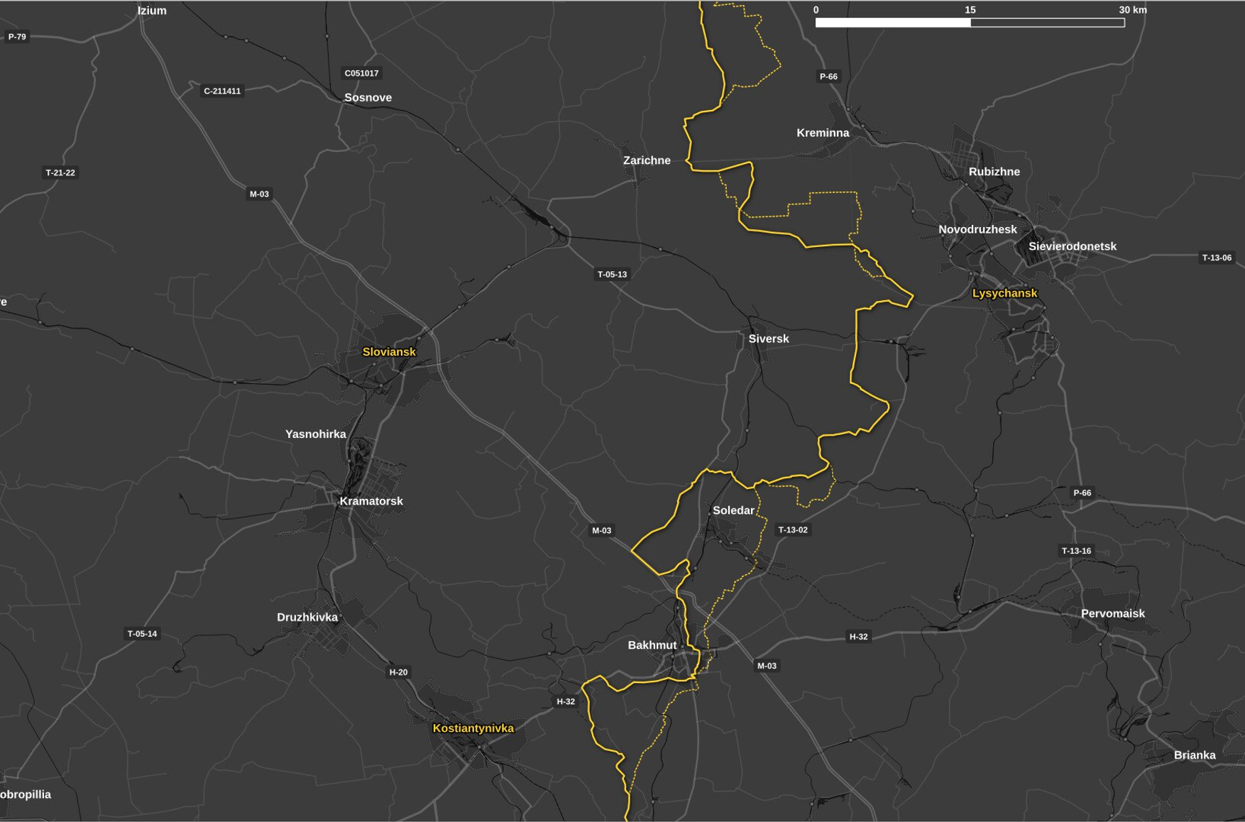 В Бахмутском районе идут ожесточенные бои, пишет военный обозреватель Чак Пфаррер. Цель российских военных — перерезать линии снабжения украинских войск и захватить дорожные развязки, чтобы уменьшить возможности противника для маневра. Российские силы, в том числе подразделения ВДВ, пытаются перерезать стык на шоссе М03/Т0513.
