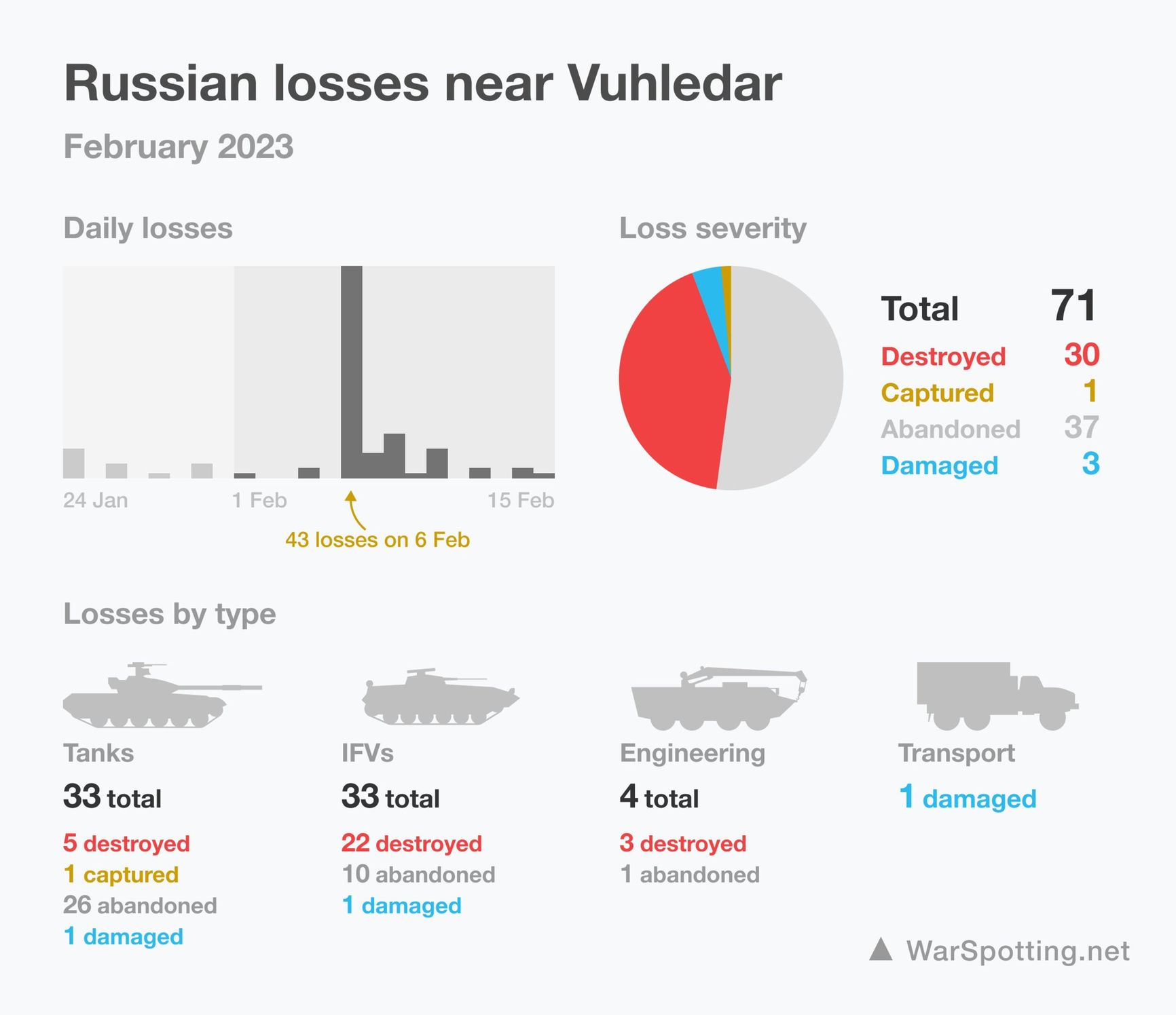 Россия потеряла под Угледаром за последние две недели 71 единицу техники. Данные об уничтоженных, брошенных, а также поврежденных или захваченных танках и машинах опубликовал OSINT-портал WarSpotting. Согласно отчету, составленному на основе информации из открытых источников, операция России на этом направлении пошла не так, как планировалось, потери составили до одной механизированной бригады.