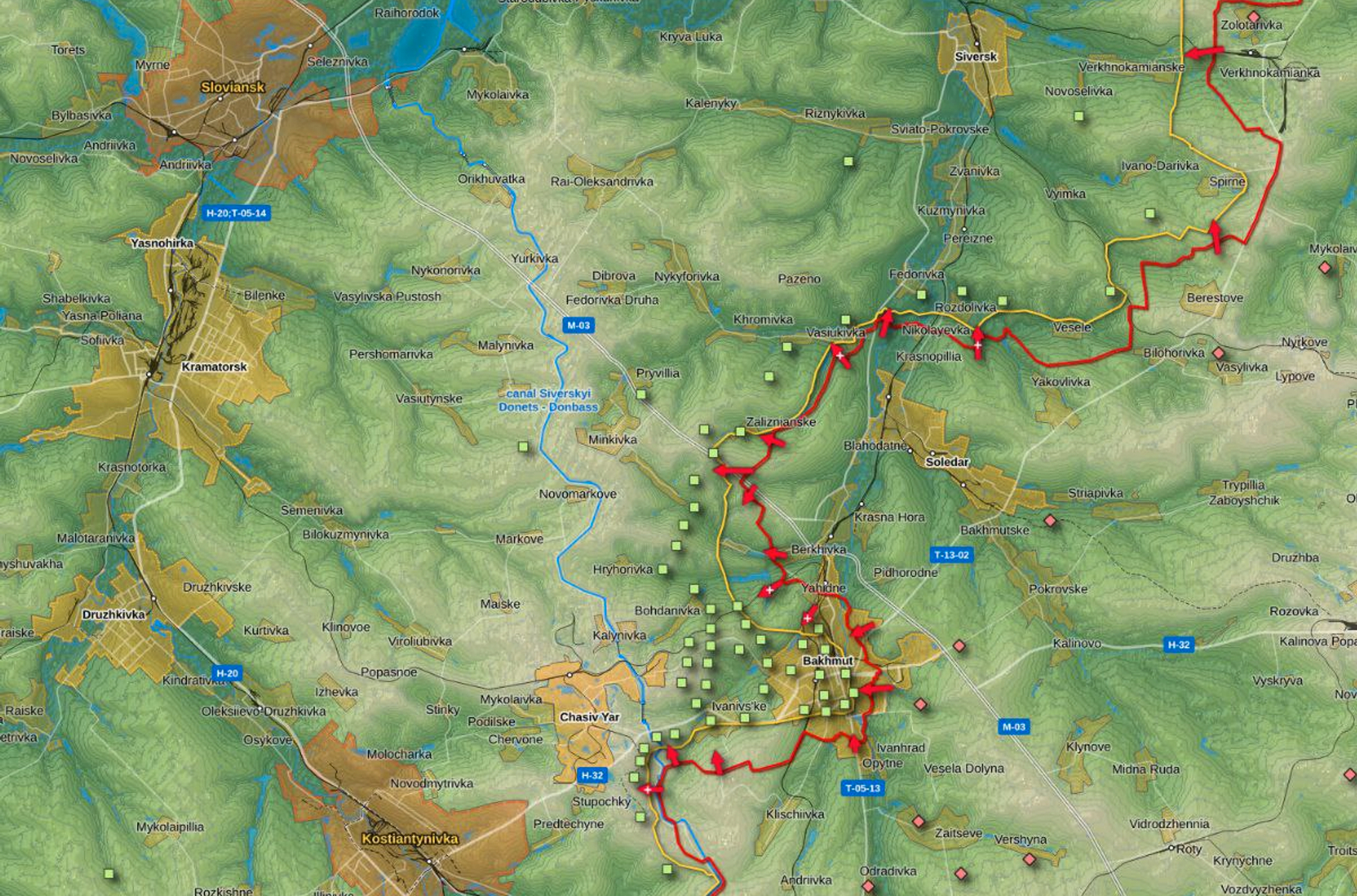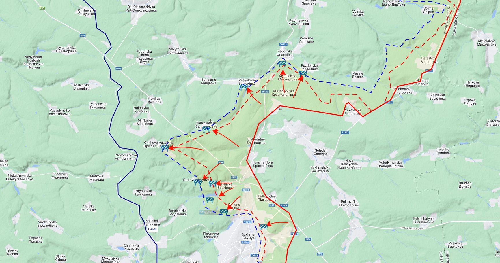 Военный эксперт Роман Свитан заявил в разговоре с The Insider, что часть реки Бахмутка встроена в общий рубеж обороны, который завязан на высотах в районе Часова Яра. Там расположена артиллерия, которая не дает российской группировке зайти в город и прикрывает куполом гарнизон ВСУ в Бахмуте.