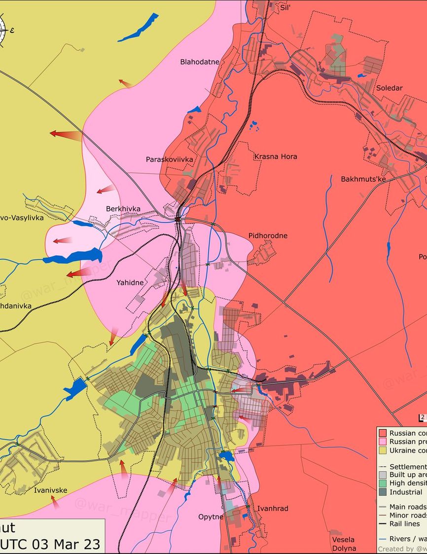 Сама ЧВК Вагнера продолжает заявлять о своих успехах. Вечером 2 марта глава боевиков Евгений Пригожин опубликовал видео, на котором наемники якобы стоят со своим флагом недалеко от центра Бахмута. Позже выяснилось, что на видео — восточные окраины города, которые уже продолжительное время захвачены российскими войсками.