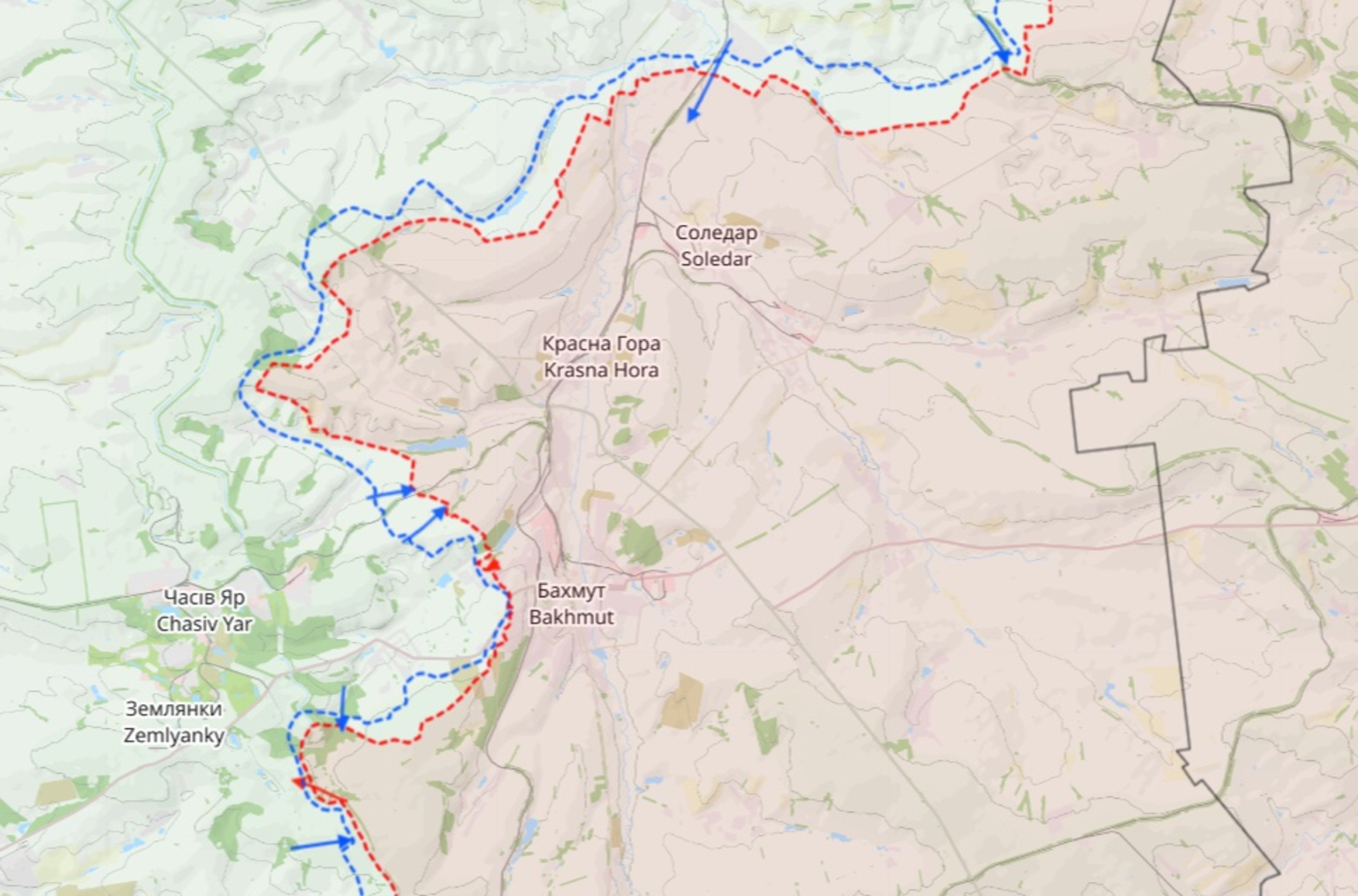 Обе карты согласуются с заявлением Минобороны об отходе россиян к Берховскому водохранилищу. Новые рубежи находятся в 2–3 километрах к северу от недавней линии боевого соприкосновения, что весьма существенно по меркам боев за Бахмут, где продвижение до сих пор измерялось десятками и сотнями метров в день. В любом случае, очевидно, что россияне оставили позиции в районе трассы Бахмут — Часов Яр, что должно хотя бы частично обезопасить проезжающую по ней военную технику и транспорт ВСУ.
