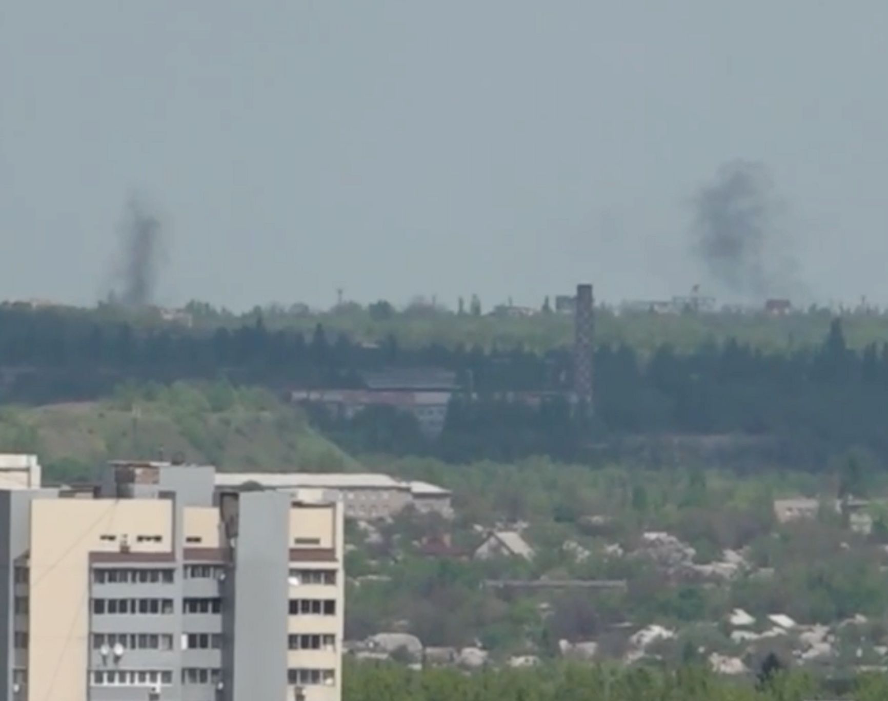 «Военкоры» сообщают об обстреле Киевского района Донецка, в результате которого погиб один человек. На видео можно заметить несколько небольших клубов дыма.