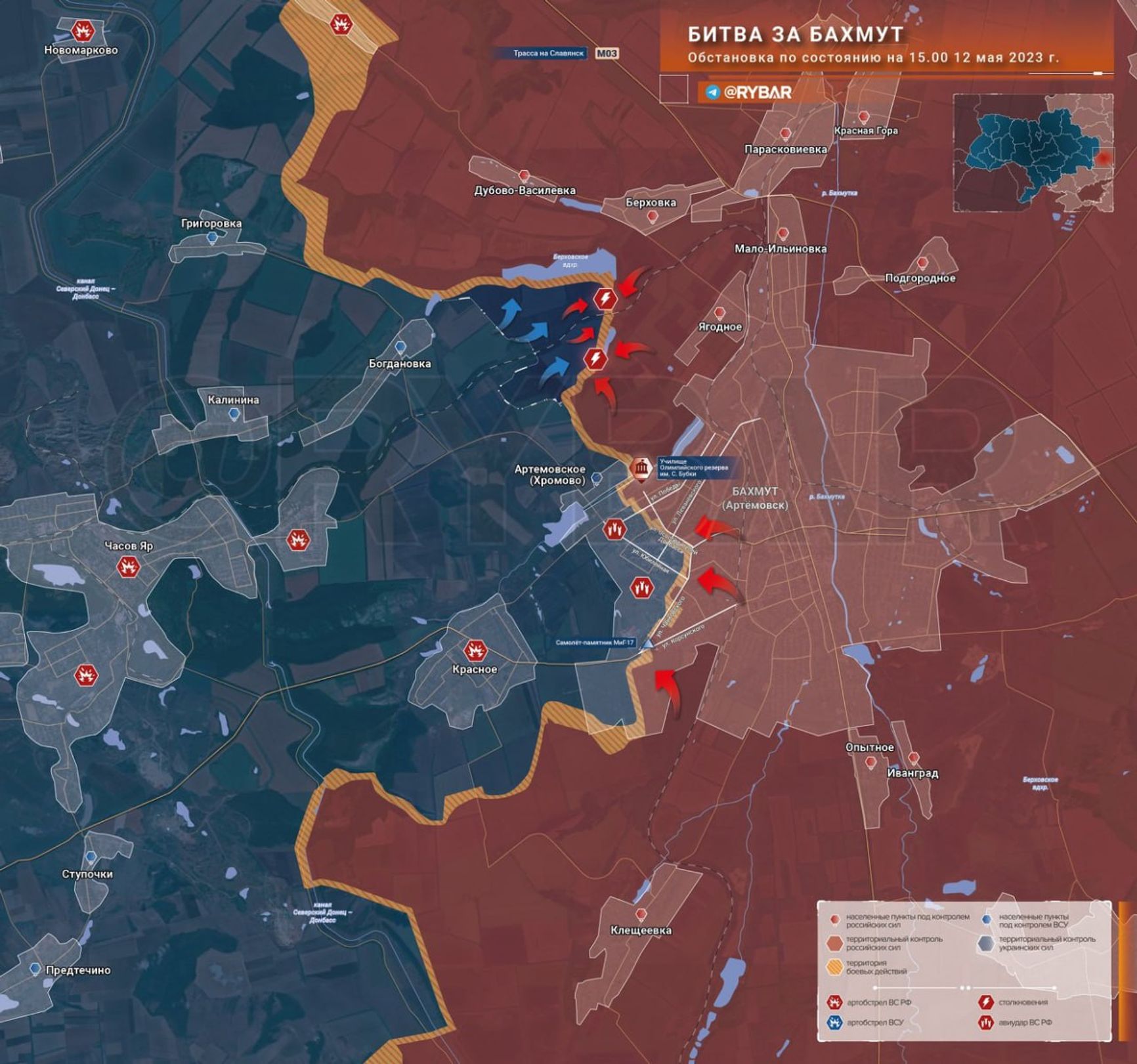 По версии аффилированного с Минобороны РФ Telegram-канала «Рыбарь», продвижение украинцев к северу от Бахмута также довольно серьезное. В канале пишут об оставленных позициях на восточной окраине села Богдановка и в «серой зоне» в полях, а также в районе к югу от водохранилища до восточной оконечности дамбы. «Рыбарь» подтверждает продвижение ВСУ на 2 км в глубину фронта. Канал подтверждает и наличие на картах российского Генштаба не существующего с 1965 года населенного пункта Малоильиновка, но почему-то называет его Мало-Ильинкой.