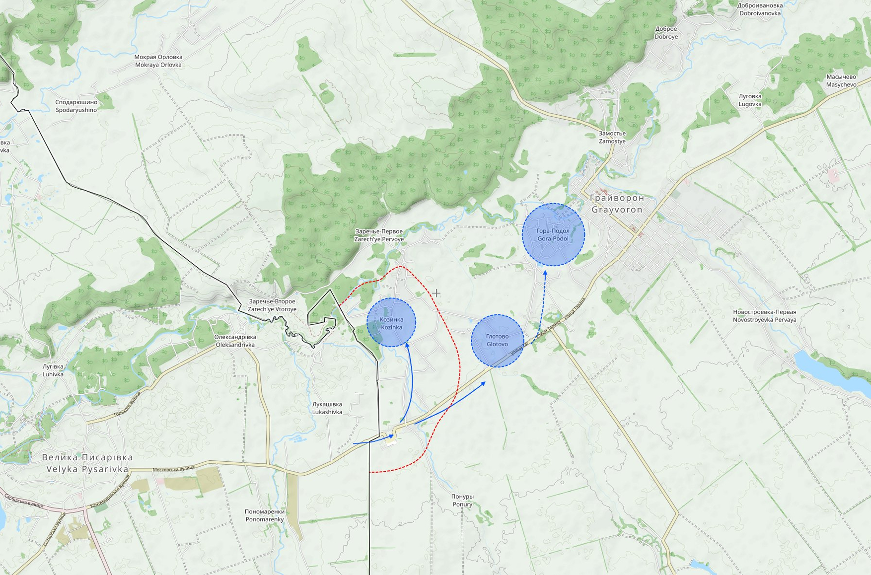 Аффилированный с Минобороны РФ Telegram-канал «Рыбарь» писал о заходе в Белгородскую область со стороны погранперехода «Грайворон» двух танков, одного БТР и девяти бронированных боевых машин. Авторы канала сообщали, что группа смогла продвинуться до перекрестка Козинка-Глотово, после чего пешая группа дошла до Дома культуры в Глотово.