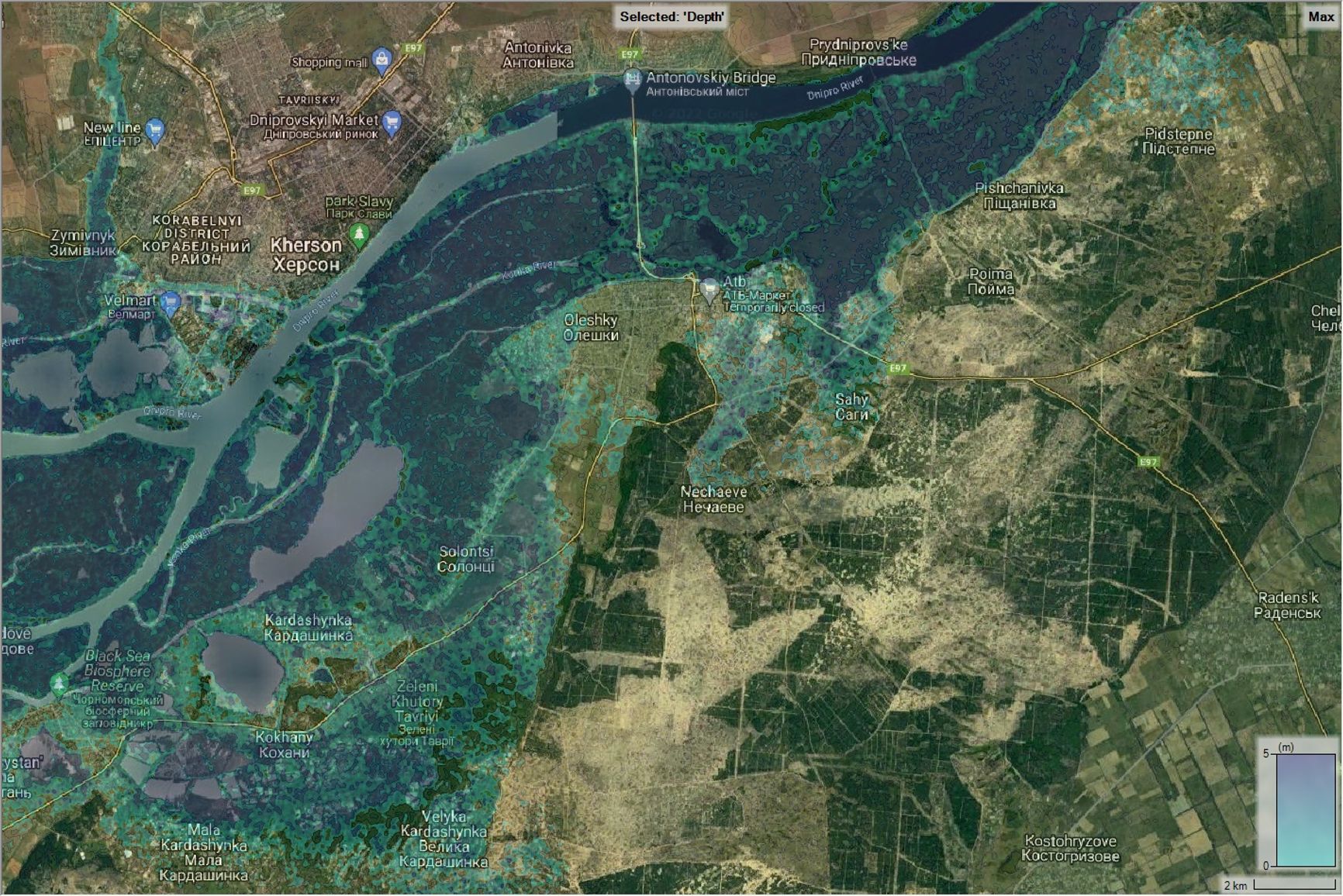 Моделирование наихудшего случая сноса российской плотины на реке Новая Каховка Днепр показывает, что по прогнозам через 19 часов на Антоновский мост к востоку от города Херсона обрушится волна 4-5 метров, вверх по реке Ингулец будет отвал, а через 4-5 дней будет затопление по Бугу до Николаева. Кроме того, снос Новокаховской плотины является военным преступлением в соответствии с Женевской конвенцией.
