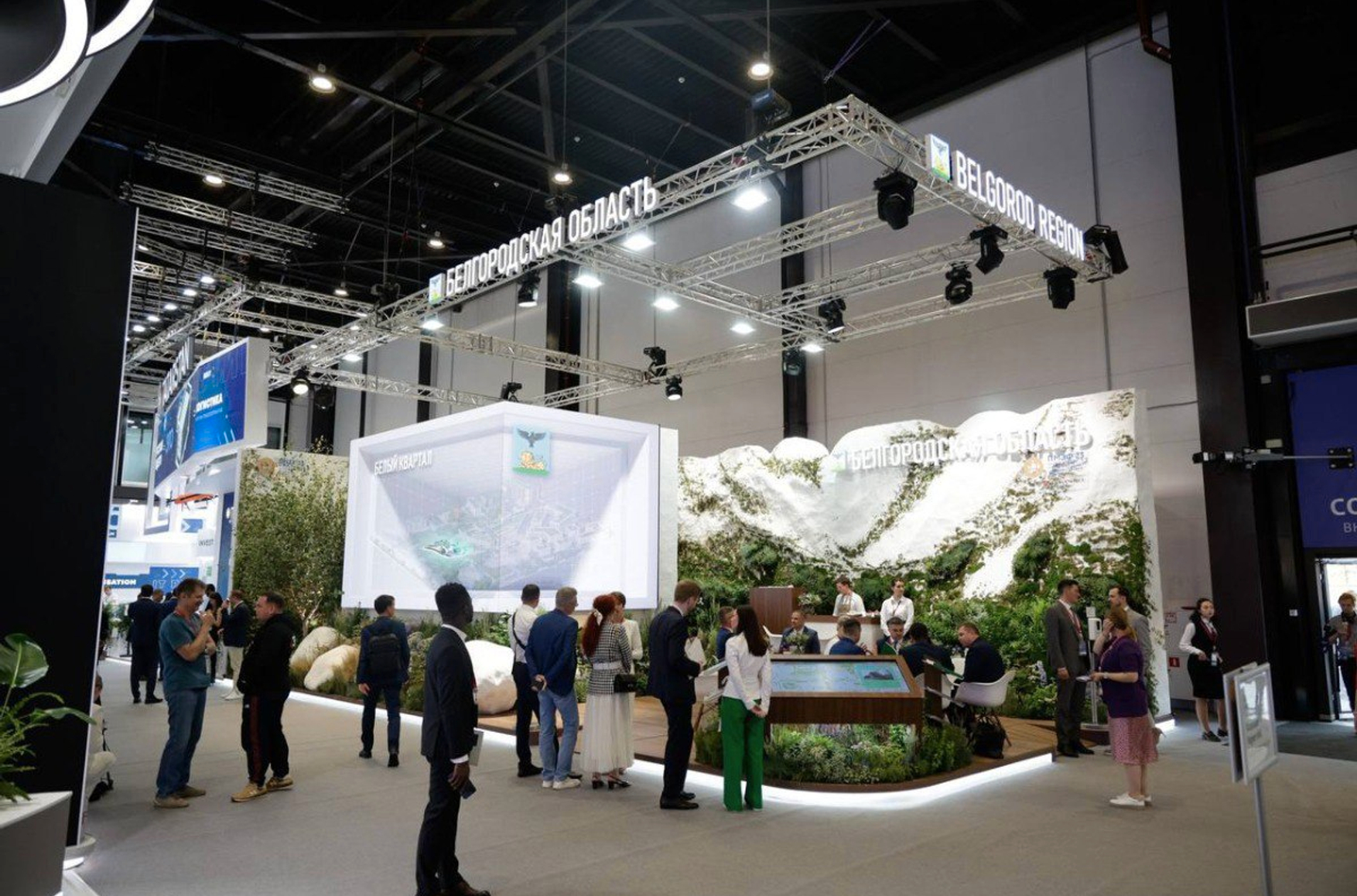 Для стенда изготовили большое панно с картой области. Элементами конструкции стали подвесной куб с экранами дополненной реальности, живые растения, травы и цветы из региона.