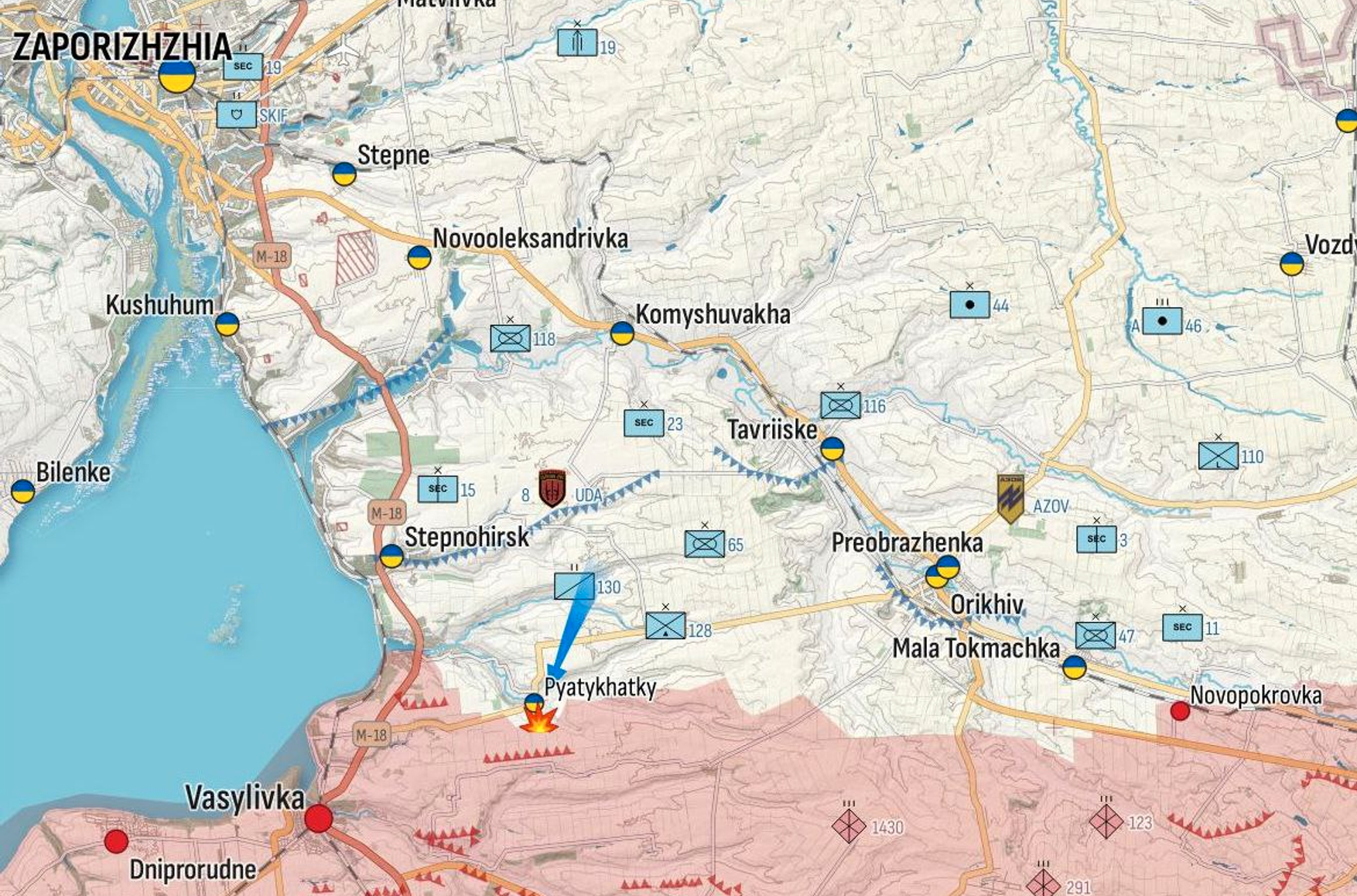 За последние несколько суток наиболее активные бои шли в районе села Пятихатки. В соцсетях Сухопутных войск ВСУ размещено видео из Пятихаток, на котором запечатлены военнослужащие 128-й горно-штурмовой бригады и 2-го отдельного стрелкового батальона, под их ногами флаг с символикой Осетии (исторический регион, в который входят российский субъект Северная Осетия и признанная Россией независимой автономия в составе Грузии Южная Осетия).