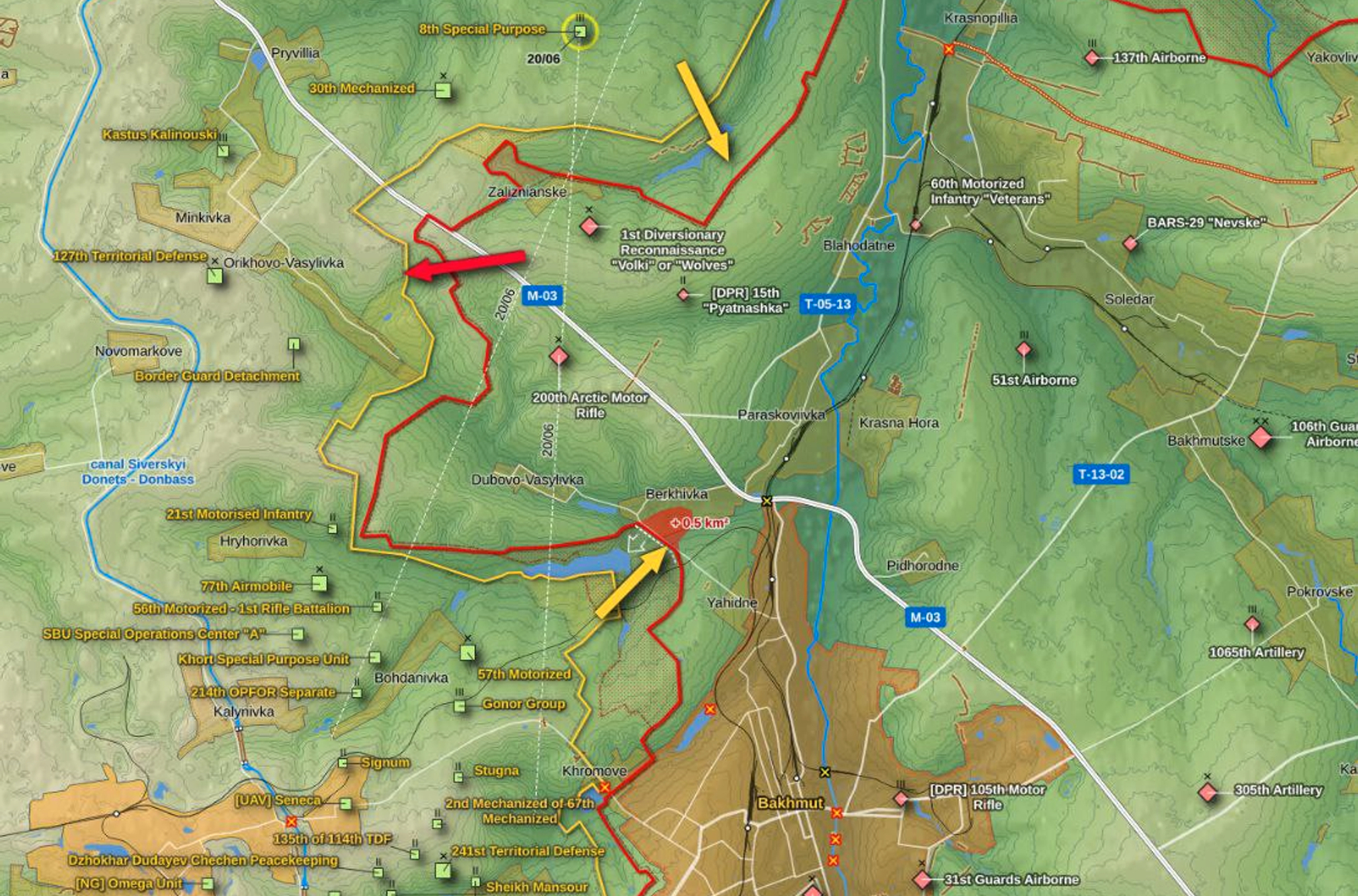 На Бахмутском направлении, по информации WarGonzo, украинские силы продвинулись к Клещеевке и находятся в менее чем полутора километрах от нее, а также пытались выйти к Ягодному и Берховке, но безуспешно. Зато после атаки со стороны села Орехово-Васильевка ВСУ заняли несколько господствующих высот и приблизились к участку трассы М-03. Кроме того, судя по геолоцированной видеозаписи, украинские войска подошли вплотную к знаменитому поселку Сакко и Ванцетти к северу от Бахмута.