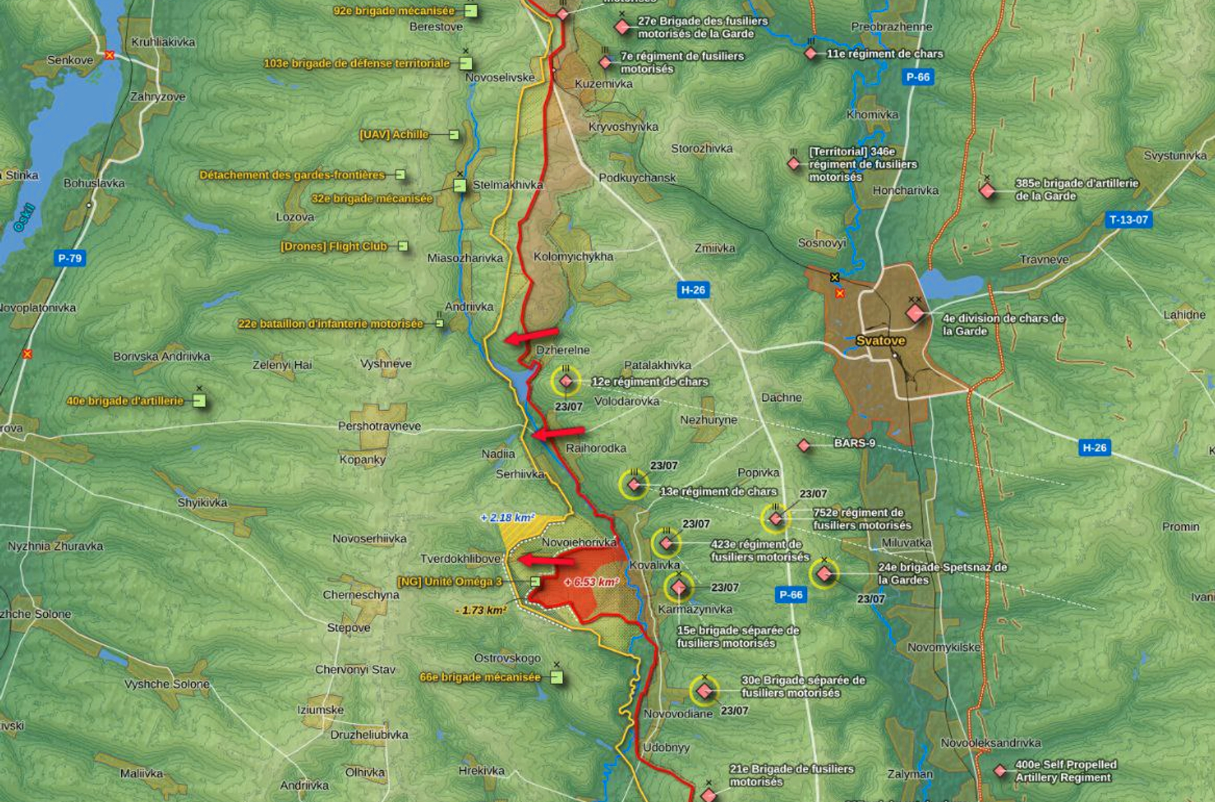 На линии Сватово — Кременная отмечено существенное продвижение российских войск в районе Кармазиновки. Telegram-канал «Военный Осведомитель» пишет, что российские подразделения смогли переправиться через реку Жеребец и занять ряд высот на другом берегу, тем самым расширив и углубив плацдарм площадью 5 на 7 км. Помимо этого, в ходе наступления со стороны Кармазиновки штурмовые подразделения трех мотострелковых бригад овладели несколькими опорными пунктами ВСУ.
